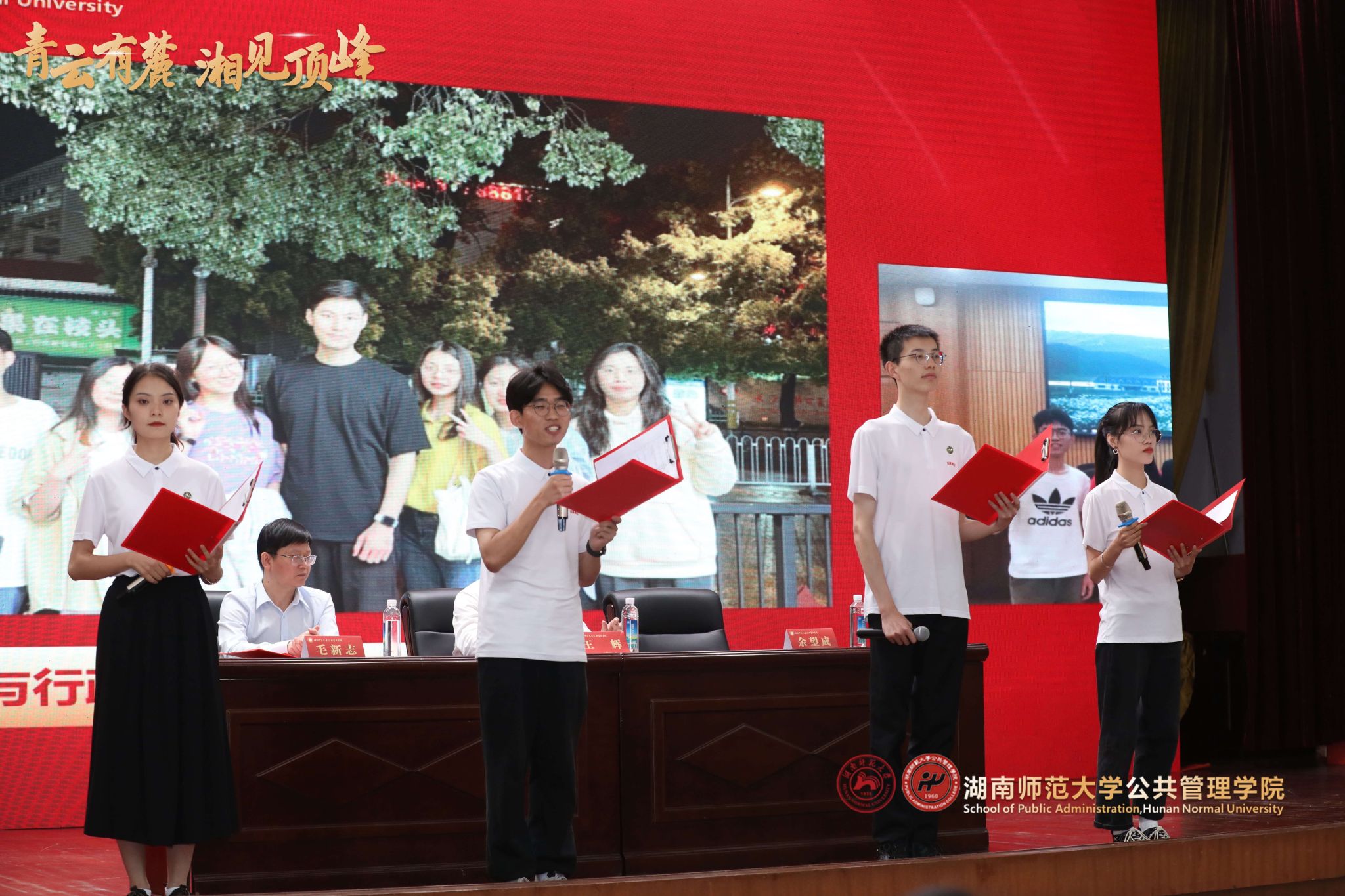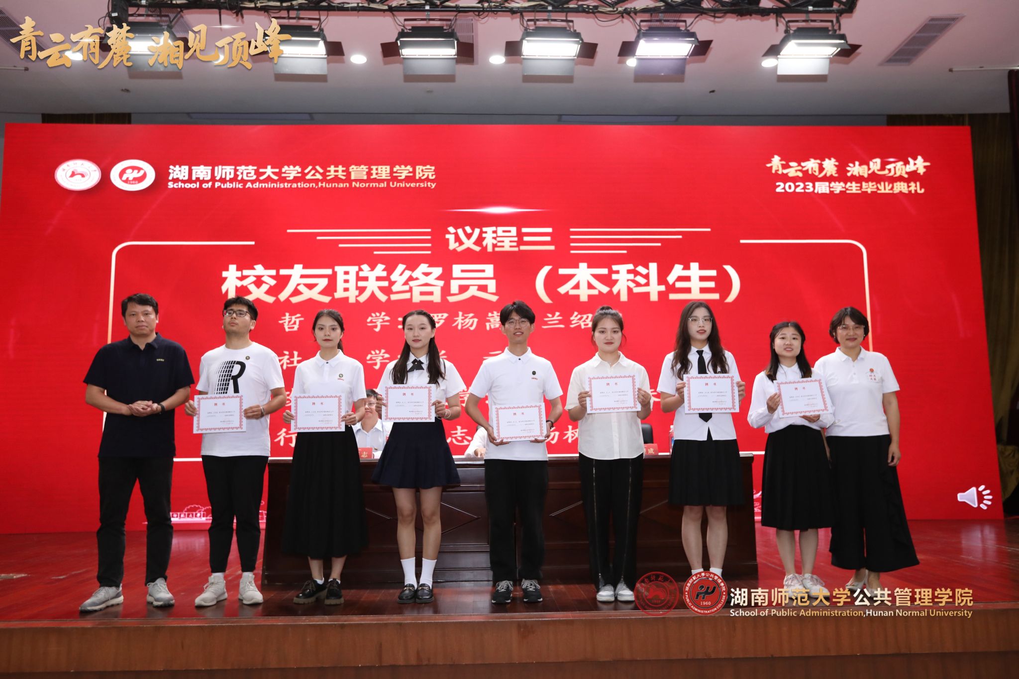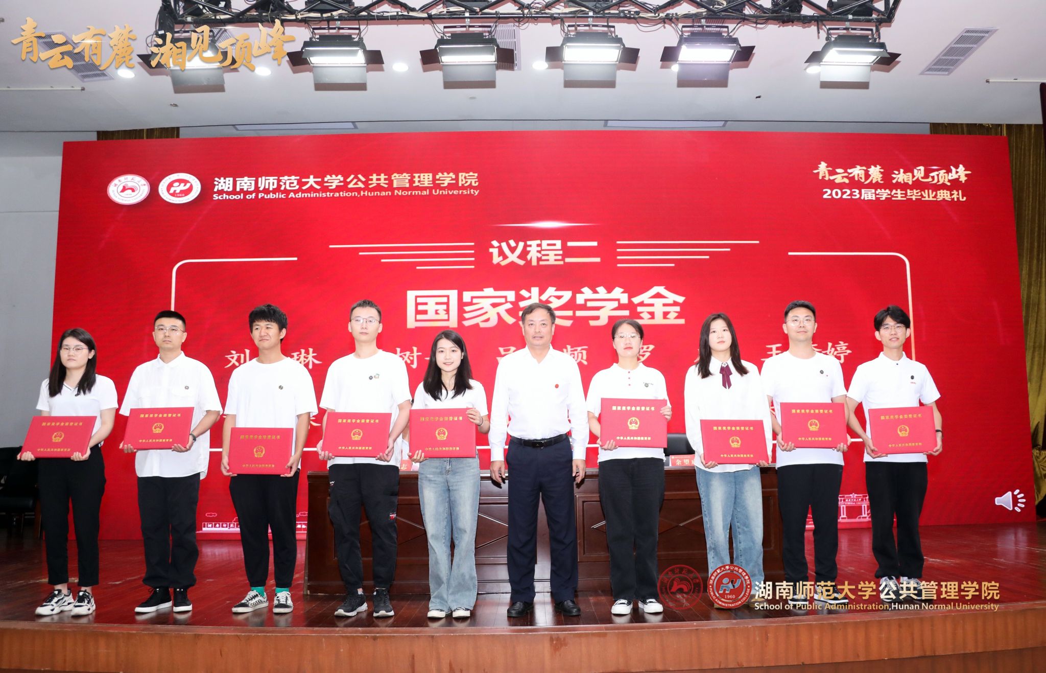 主持人余望成书记依次宣读“国家奖学金”、“2023届湖南省优秀毕业生”、“2023届湖南师范大学优秀毕业生”以及“2023届湖南师范大学优秀本科毕业论文”获奖毕业生名单;受邀领导和嘉宾分别为获奖毕业生颁发荣誉证书并与获奖同学合影留念,表达对毕业生同学即将踏上锦绣前程、迈向未来的期许与祝福。