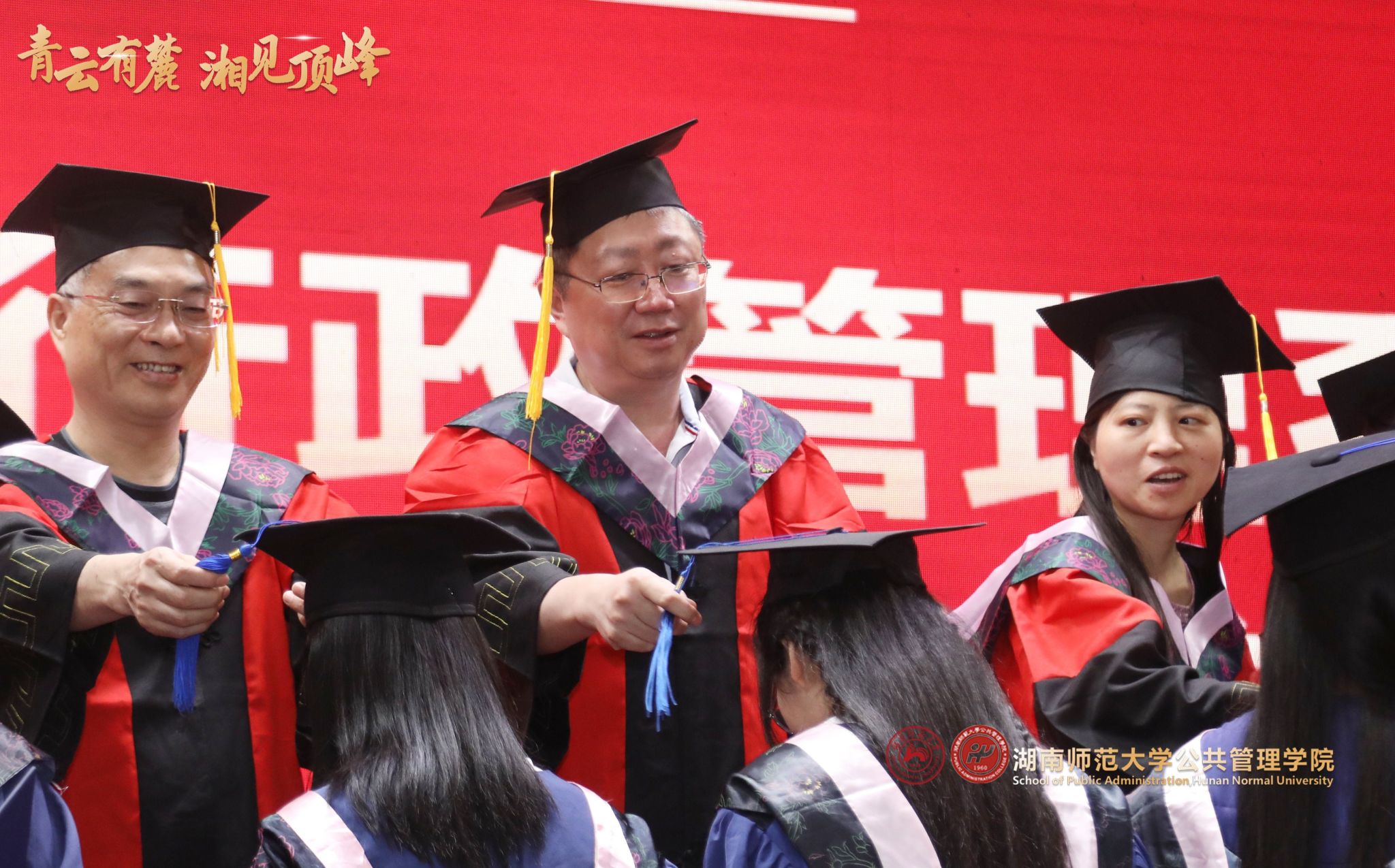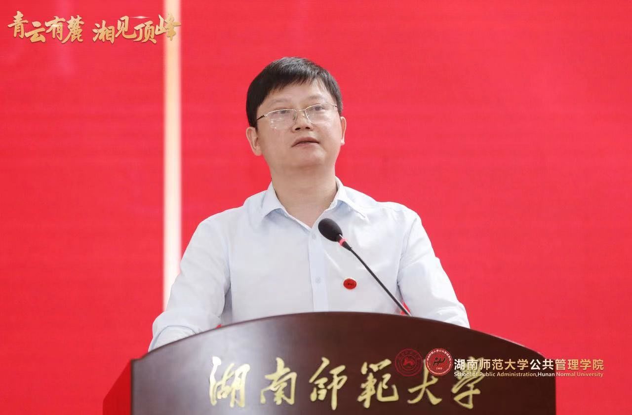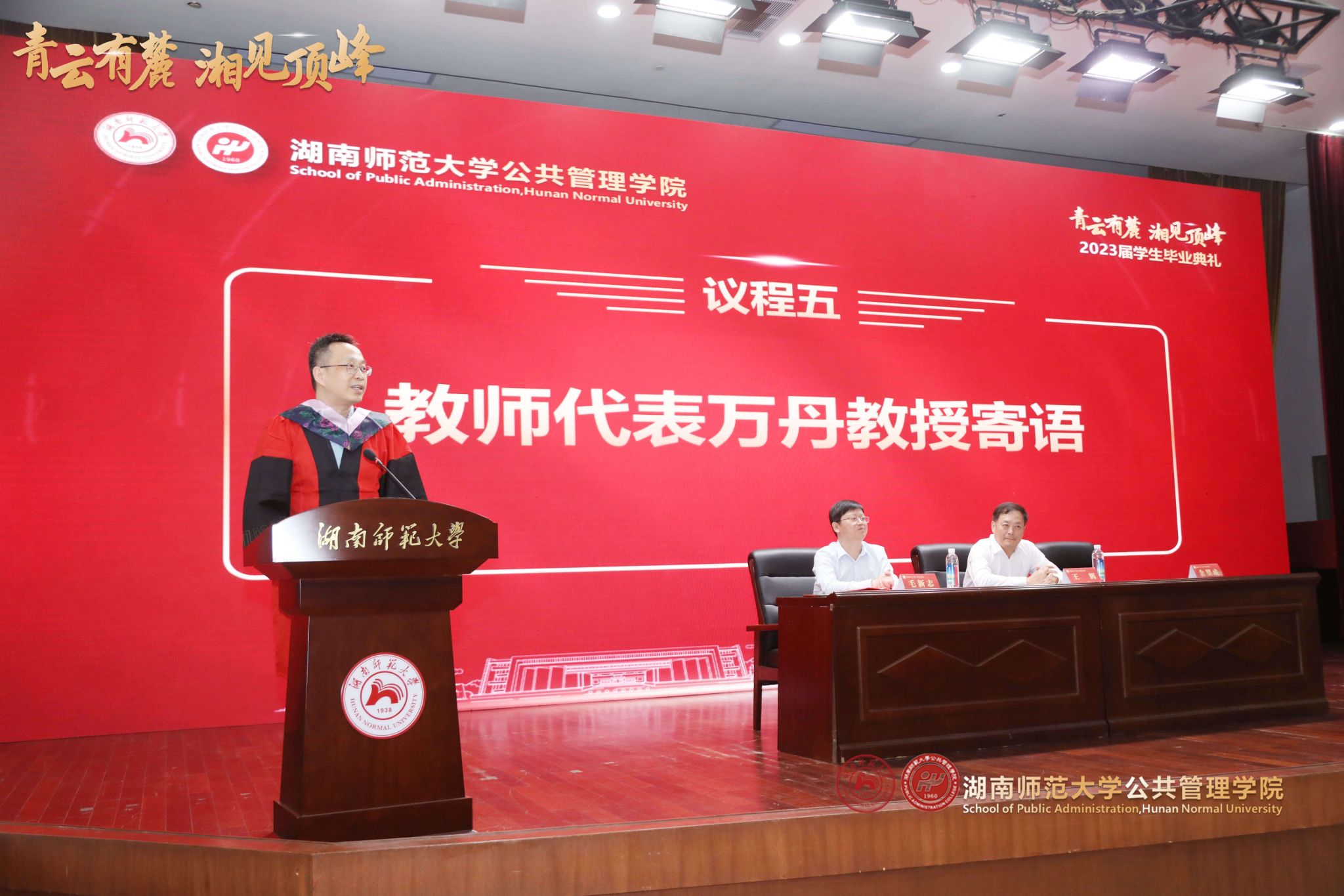 6月16日下午,公共管理学院“青云有麓,湘见顶峰”2023届毕业典礼暨学位授予仪式在湖南师范大学国际学术报告厅隆重举行。学院党委书记余望成主持毕业典礼。湖南师范大学副校长王辉,校友总会副秘书长邝洁、贺慧星,社科处副处长李超民等学校和职能部门负责同志;公共管理学院院长毛新志,道德文化研究院院长兼哲学系系主任向玉乔,院党委副书记孙雯波,主管科研副院长、政治学一级学科学位点负责人王敏,主管本科教学副院长苏静,主管行政副院长胡雪松,道德文化研究院副院长文贤庆,社会学系系主任、社会学一级学科学位点负责人罗忠勇,政治学与行政管理系系主任何琴等学院和学系负责人;哲学一级学科学位点负责人张怀承、政治学科科学社会主义博士点负责人周小毛、社会工作专业硕士点负责人孙建娥、MPA专业硕士点负责人刘茜等学位点导师代表以及本科毕业生班导师、研办和学工办的老师出席毕业典礼。