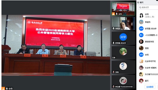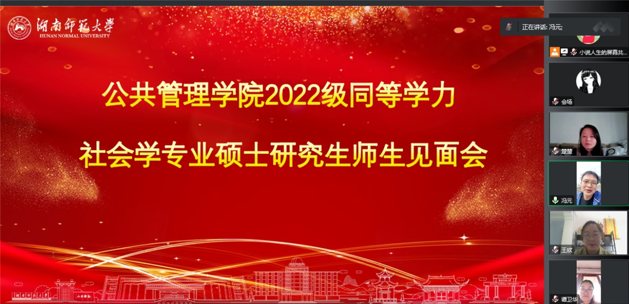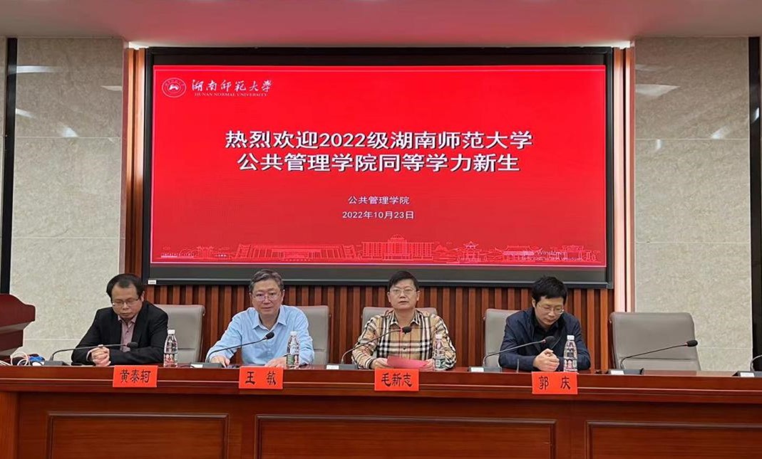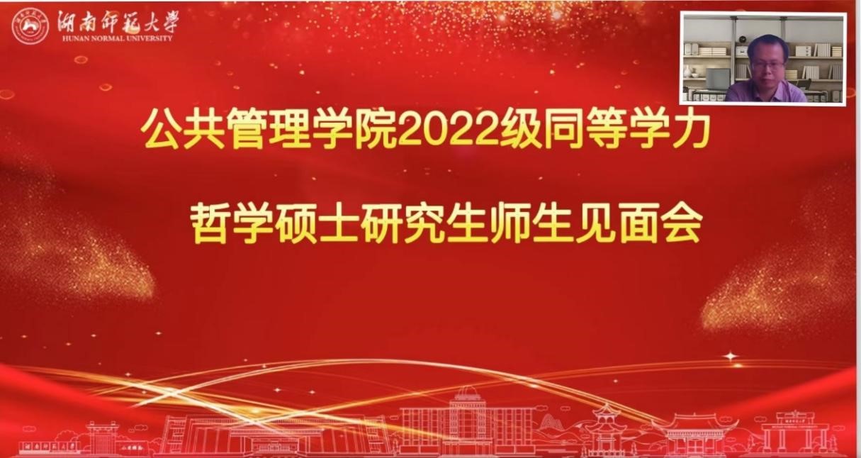 (通讯员 钮轶潇)10月23日上午,我院2022级同等学力申硕研究生班开学典礼暨师生见面会在景德楼南栋三楼学术报告厅隆重举行。本次活动以线上线下相结合的方式开展。公共管理学院院长、博士生导师毛新志教授,公共管理学院副院长、政治学硕士点负责人、博士生导师王敏教授,社会学硕士点代表教师郭庆副教授,哲学硕士点代表教师黄泰轲博士,研究生办主任陈怡,蘧垣志老师参加线下会场;公共管理学院副院长、博士生导师李超民教授及2022级同等学力申硕研究生参加线上会场。开学典礼由王敏副院长主持。