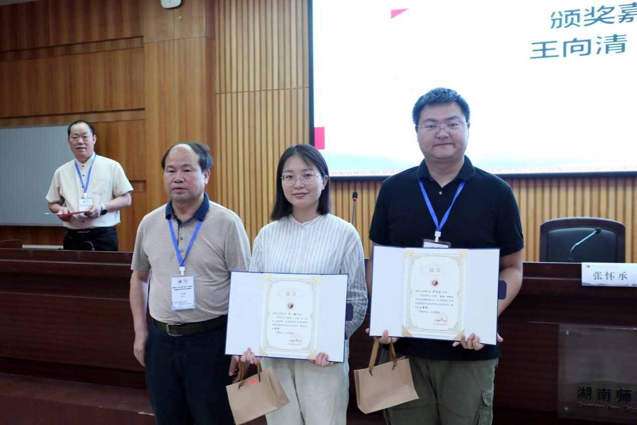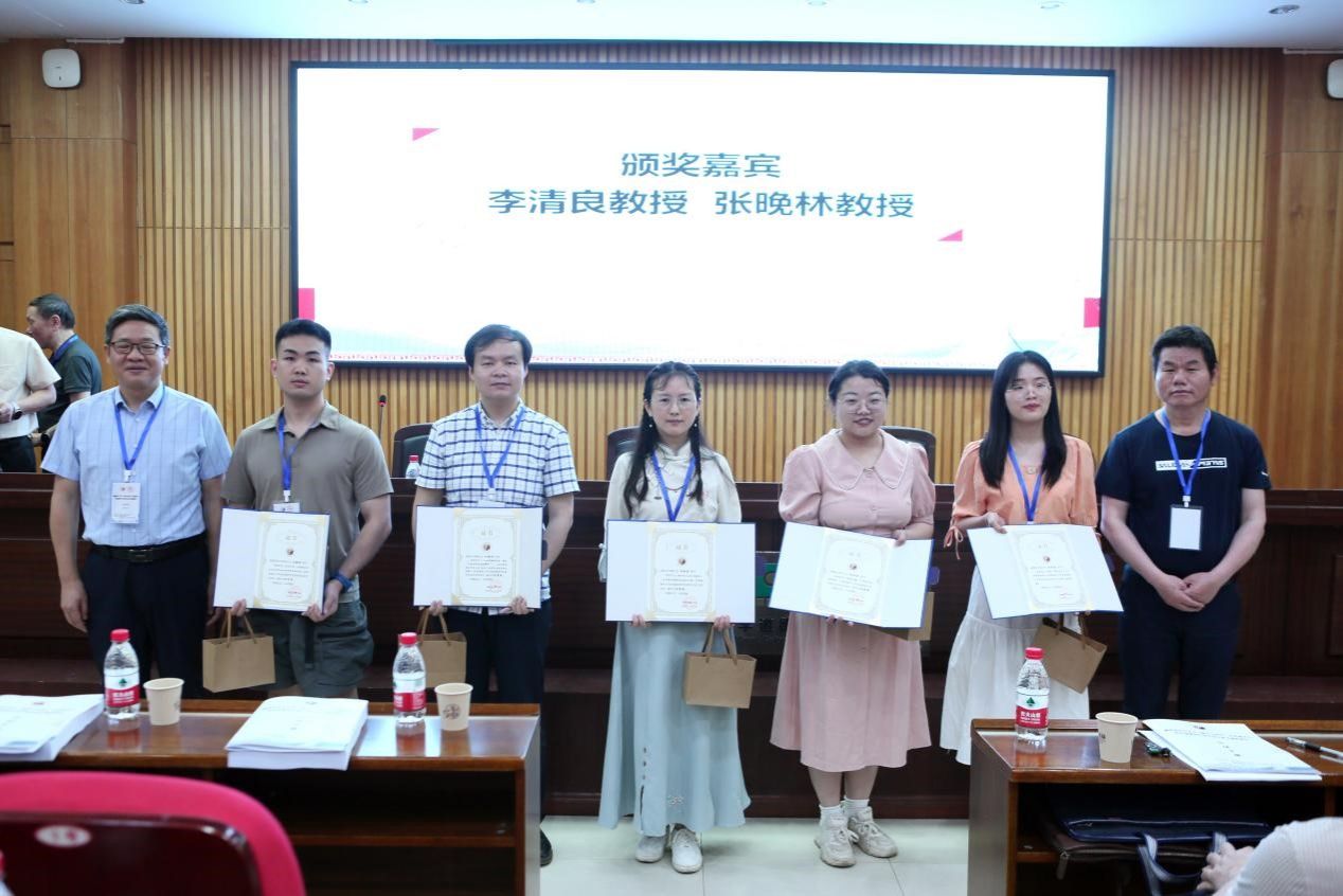 (李清良教授、张晚林教授为优秀奖获得者湖南大学博士生田晓丹与补鹏挥、湘潭大学硕士生宫琴琴与林延廷、湖南师范大学硕士生吕韬频等颁奖)