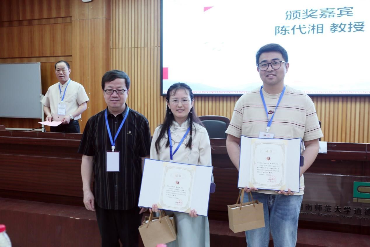 (陈代湘教授为三等奖获得者华东师范大学博士生王九洲及湖南大学博士生汪美玲、薛建立颁奖)