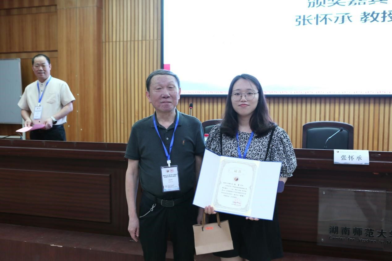 (张怀承教授为一等奖获得者湖南大学博士生庞鑫颁奖)