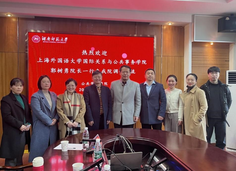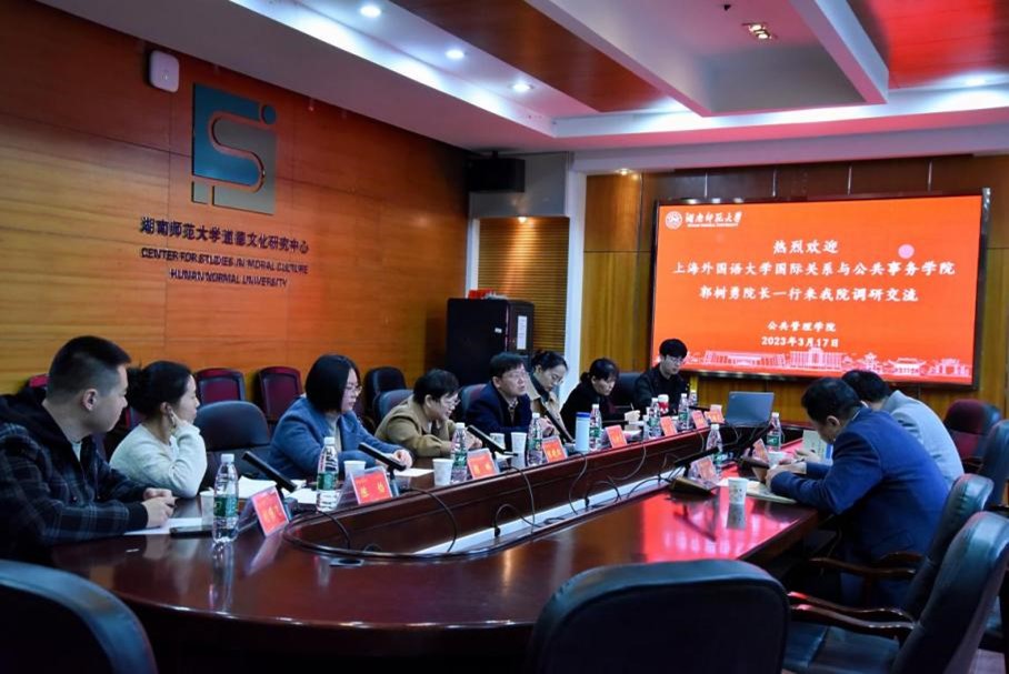 会议伊始,毛新志院长对郭树勇院长一行的到来表示热烈欢迎,就我院的历史沿革、学科建设、育人体系建设等方面进行了简要介绍。他表示,我院历来重视学生的招生、教育、管理和就业等一体化培养工作,以切实提高学生综合素质为目标,希望两个学院能够保持高效交流,共同推进教育事业稳步发展。陈晓红教授介绍了我院国际政治专业的建设发展,她表示自身与上海外国语大学有着深厚的友谊,希望能继续保持友好往来,加强深入探讨,为学科发展贡献力量。刘茜副教授从MPA教育中心的招生情况、师资力量、专业课程等方面进行了详细介绍。她指出,我院MPA教育中心始终坚持在规范中求创新、在发展中求特色,努力打造成湖南省、全国性的教育品牌。颜琳副教授从自身的研究兴趣、研究领域及相关成果等方面进行了简要介绍,表示要紧跟国际发展方向和热点话题进行科学研究。