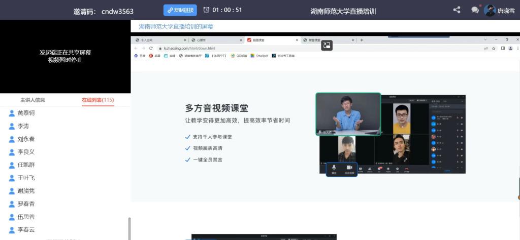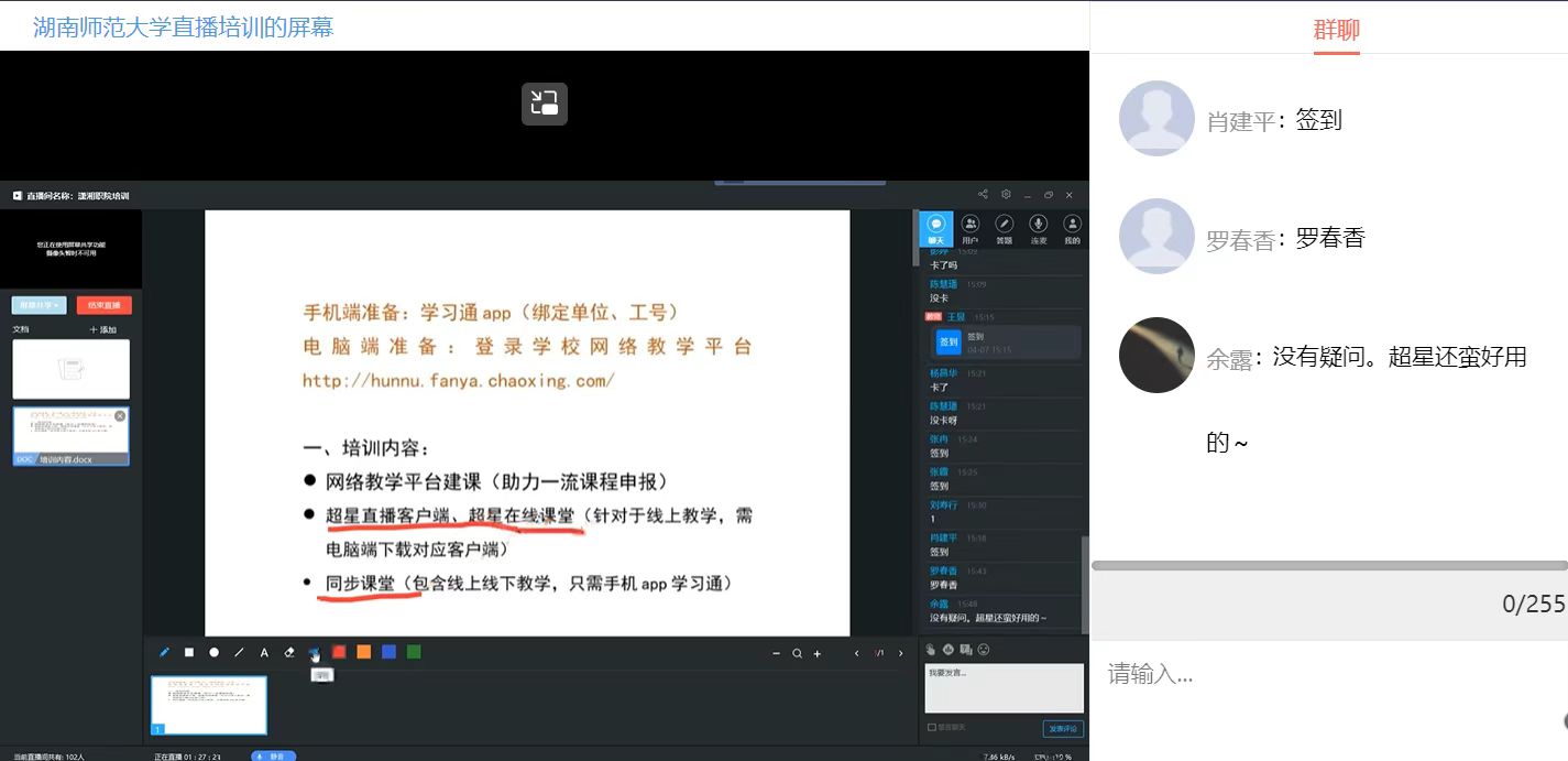 本次培训主要包括两个环节,首先,超星学习通的培训师进行为时60分钟的操作演练,王昱培训师结合自己多年与高校合作建设线上一流课程的经验,演示了信息化教学平台的操作流程和使用技巧,向教师们讲授了如何利用学校已有的教学平台进行课程教学。其次,参加此次培训的教师根据直播内容进行提问,由培训师进行答疑解惑,限时40分钟。