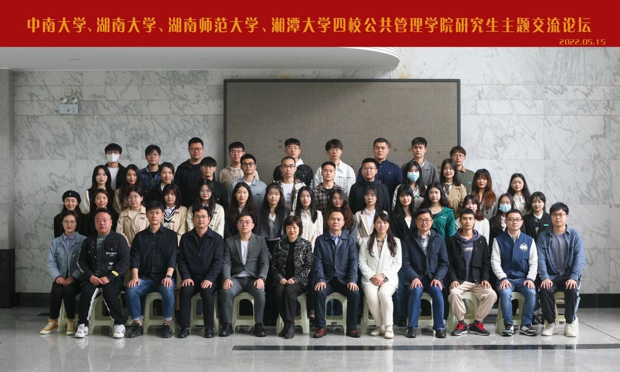 (通讯员郑俞希)2022年5月15日,我院10位研究生代表受邀参加了由湘潭大学公共管理学院主办的“锻造公管共同体,共话发展新篇章”四校交流论坛。本次交流论坛于湘潭大学东附楼会议室举行,来自中南大学、湖南大学、湖南师范大学、湘潭大学四所高校公共管理学院200多名师生代表参加会议。开幕式由湘潭大学公共管理学院党委书记易臣何主持。