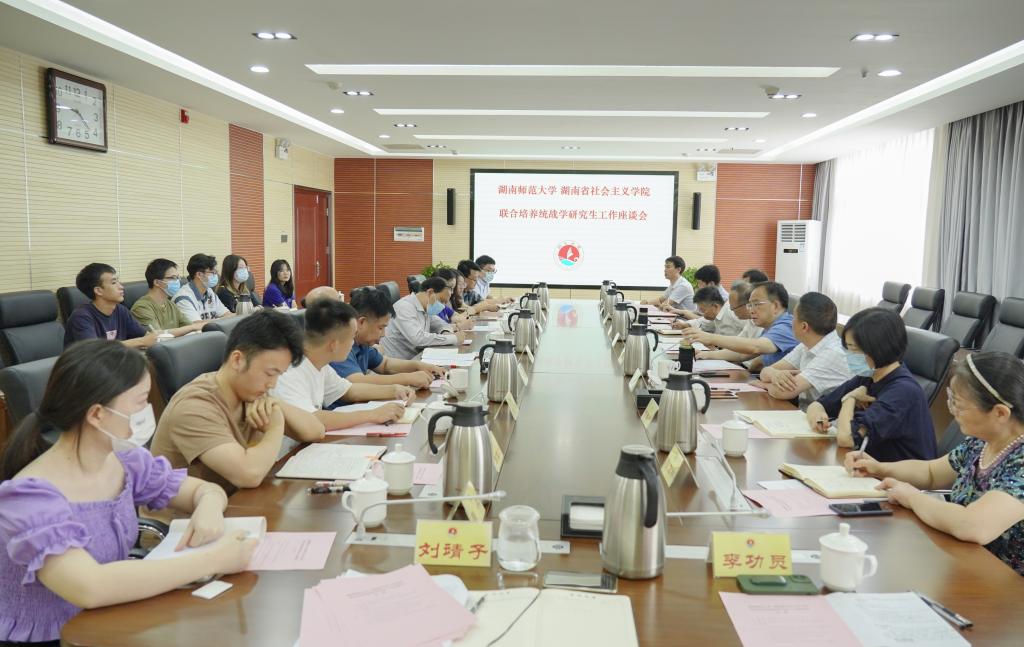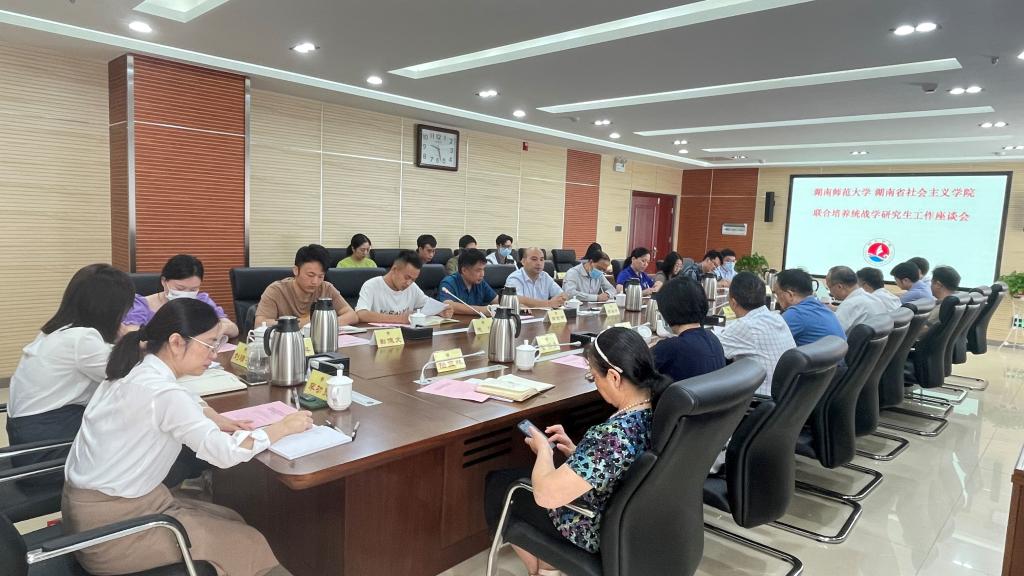 9月30日上午,湖南师范大学—湖南省社会主义学院联合培养统战学研究生工作座谈会在省社会主义学院隆重召开。湖南省委统战部副部长、省社会主义学院党组书记丁学新、湖南省社会主义学院院长雷鸣强、副院长黄自荣、原一级巡视员周述杰教授、教研部主任陆亚林等领导和教师出席会议。