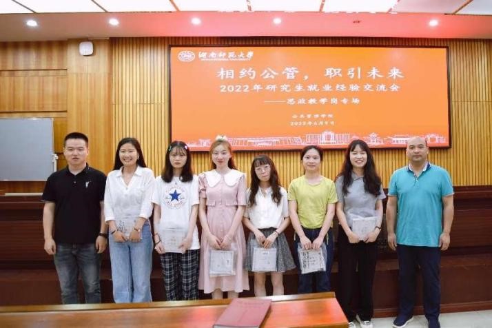 (通讯员 吴永珍)为帮助同学们提前做好学业规划和求职准备,丰富同学们的就业技巧与经验,促进研究生高质量就业,2022年6月9日下午,我院于景德楼中栋三楼学术报告厅顺利举办了毕业季第二场经验交流分享会——“相约公管,职引未来”之思政教学岗专场。此次分享会由研办胡耀飞老师主持,副院长李超民教授出席会议。来自哲学专业的朱亚楠、李佳宁,政治学专业的李谆谆、吴格格,学科思政专业的李玲玲、陈本莹、陈晶晶七位同学为经验分享人,学院多名研究生参加了会议。