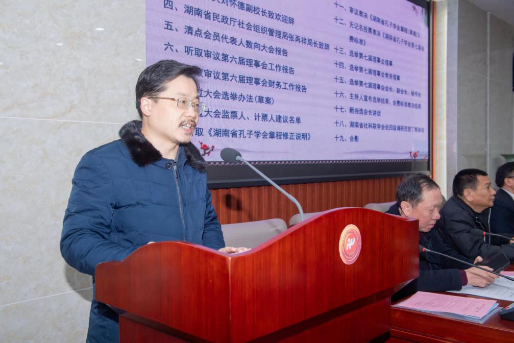 (通讯员:彭翔)12月18日上午,湖南省孔子学会第七届会员代表大会第一次会议(理事会换届大会)在湖南师范大学公共管理学院博士后楼三楼学术报告厅隆重举行。大会采取线上与线下相结合的方式,选举产生了学会第七届理事会理事,全体理事经过无记名投票选举出第七届理事会会长、副会长、秘书长、副秘书长等学会领导班子。湖南省民政厅社会组织管理局张再祥局长、黎毅科长,湖南省社科联学会处四级调研员贺丁辉,以及学会挂靠单位领导湖南师范大学刘怀德副校长、公共管理学院毛新志院长等出席了会议。会议由湖南省孔子学会副会长兼秘书长陈仁仁主持。