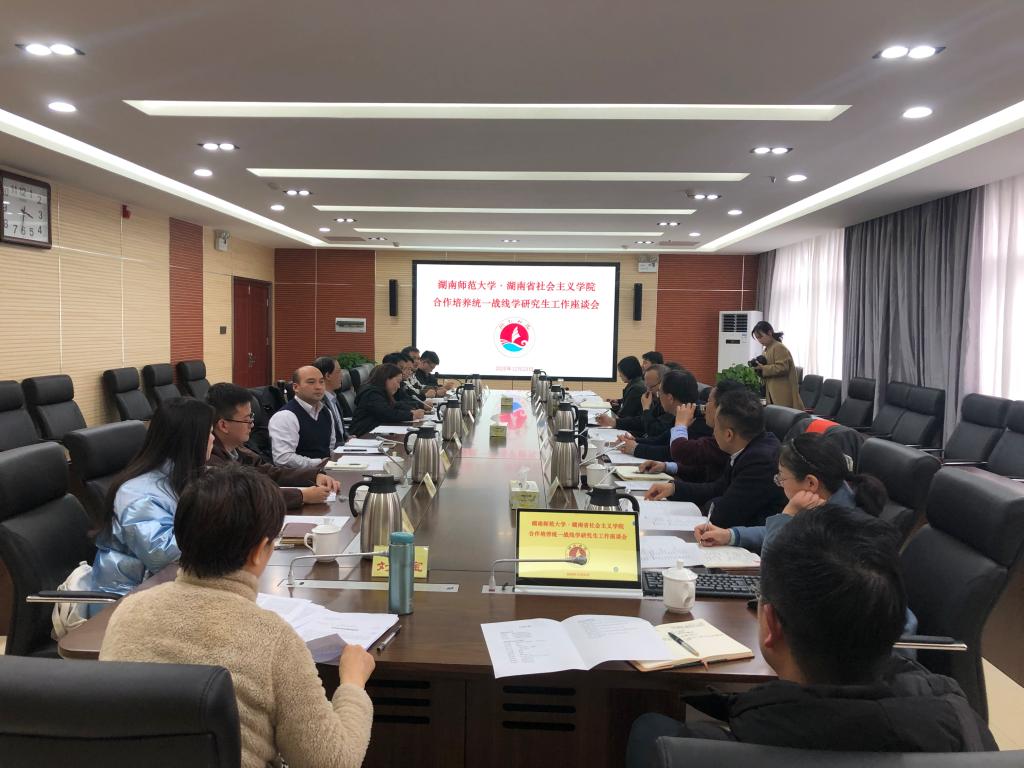 12月23号,湖南师范大学、湖南省社会主义学院合作培养统一战线学研究生工作座谈会在省社会主义学院同心楼707会议室召开。我校党委委员、党委统战部部长沈又红、党委统战部副部长刘丽娟、公共管理学院杨君武教授、肖光荣、李超民教授以及湖南省社会主义学院院长雷鸣强、副院长黄自荣、一级巡视员周述杰教授、许奕锋教授、雷明贵教授、教研部主任陆亚林、以及办公室、行财处、教务处、科研处相关领导出席会议。座谈会由省委统战部副部长、省社会主义学院党组书记丁学新主持。