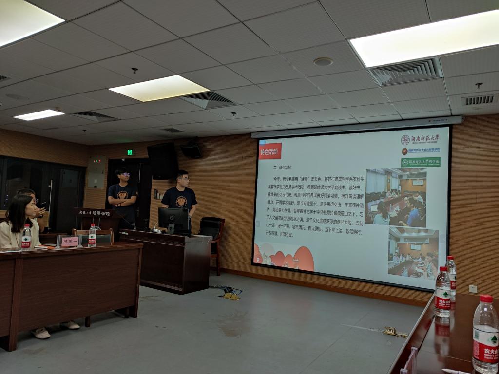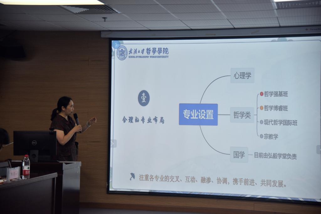 8日下午,毛院长率研学团队于武汉大学振华楼B107教室参加哲学学院举行的欢迎仪式和双方师生交流会。武汉大学哲学学院院长李佃来、党委副书记严璨、副院长李志、团委书记李懿、教学科研管理办副主任陈苏一以及哲学学院部分学生出席会议。首先,李佃来院长致欢迎辞,并简要介绍了哲学学院的总体情况;其次,严璨副书记以何以成人、谁来培养人、如何培养人、培养什么样的人等问题为导向,具体、简明地展示了哲学学院人才培养的状况;随后,李志副院长从专业布局、学科设置、培养目标、培养计划、培养模式、师资力量、教学资源、课程思政等方面,比较全面、细致地呈现了哲学学院本科生人才培养的情况;接着,我方毛院长衷心感谢武汉大学哲学学院为本系学子提供了珍贵的研学机会,并对湖南师范大学哲学系的历史与现状、景德学堂-哲学拔尖人才培养基地班的办学情况等作了较为详实的介绍,他表达了同武汉大学哲学学院进行深度交流与合作的期望;之后,双方学生一一发言,就各自的基本情况、所在院系或班级的状况、学习哲学的体会等方面进行了初步交流,增进了彼此的了解。