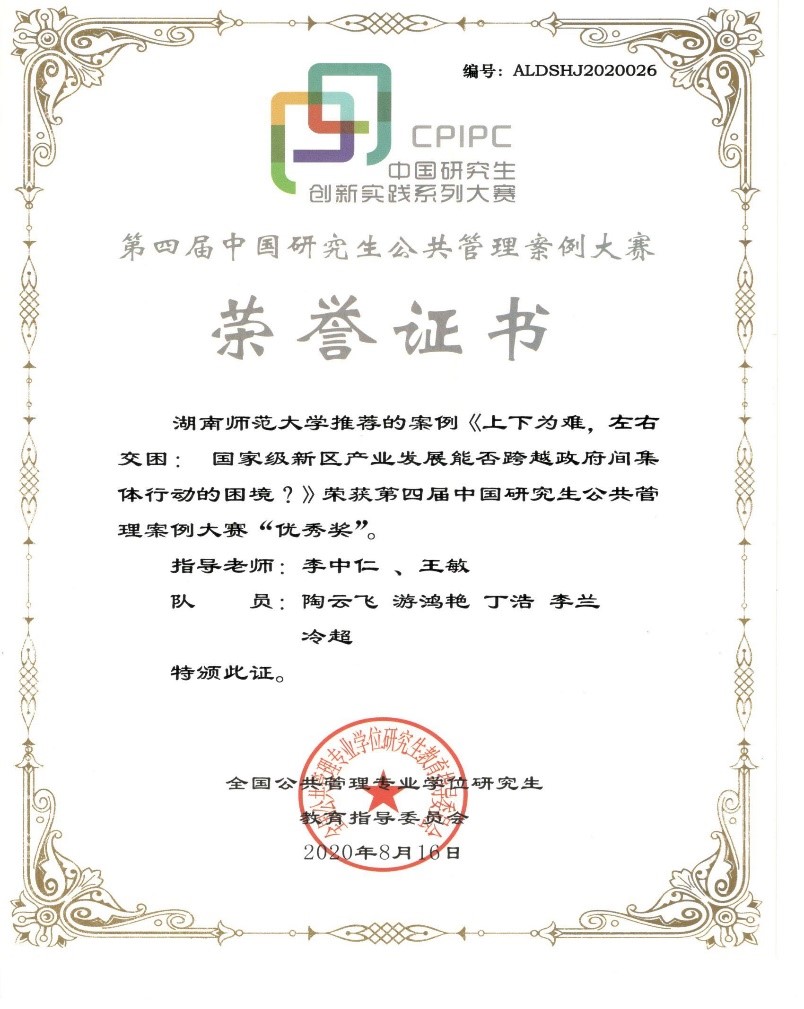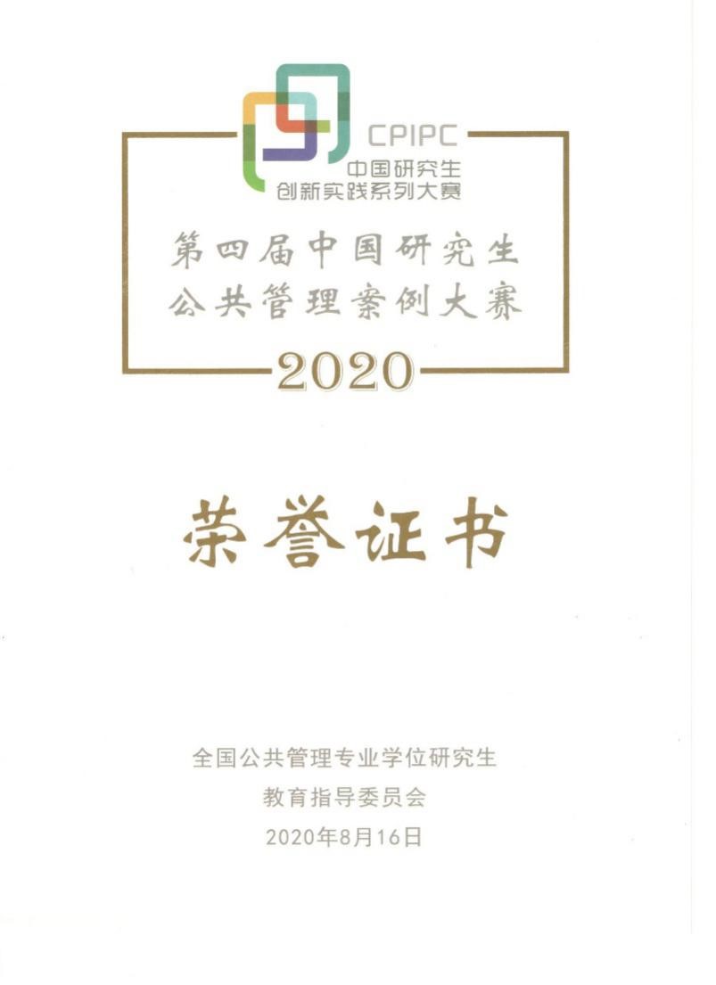 (通讯员 王绪)近日,第四届中国研究生公共管理案例大赛获奖证书寄至我校,公共管理学院由公共管理专业硕士(MPA)和政治学专业硕士研究生组成的代表队在比赛中喜获优秀奖。