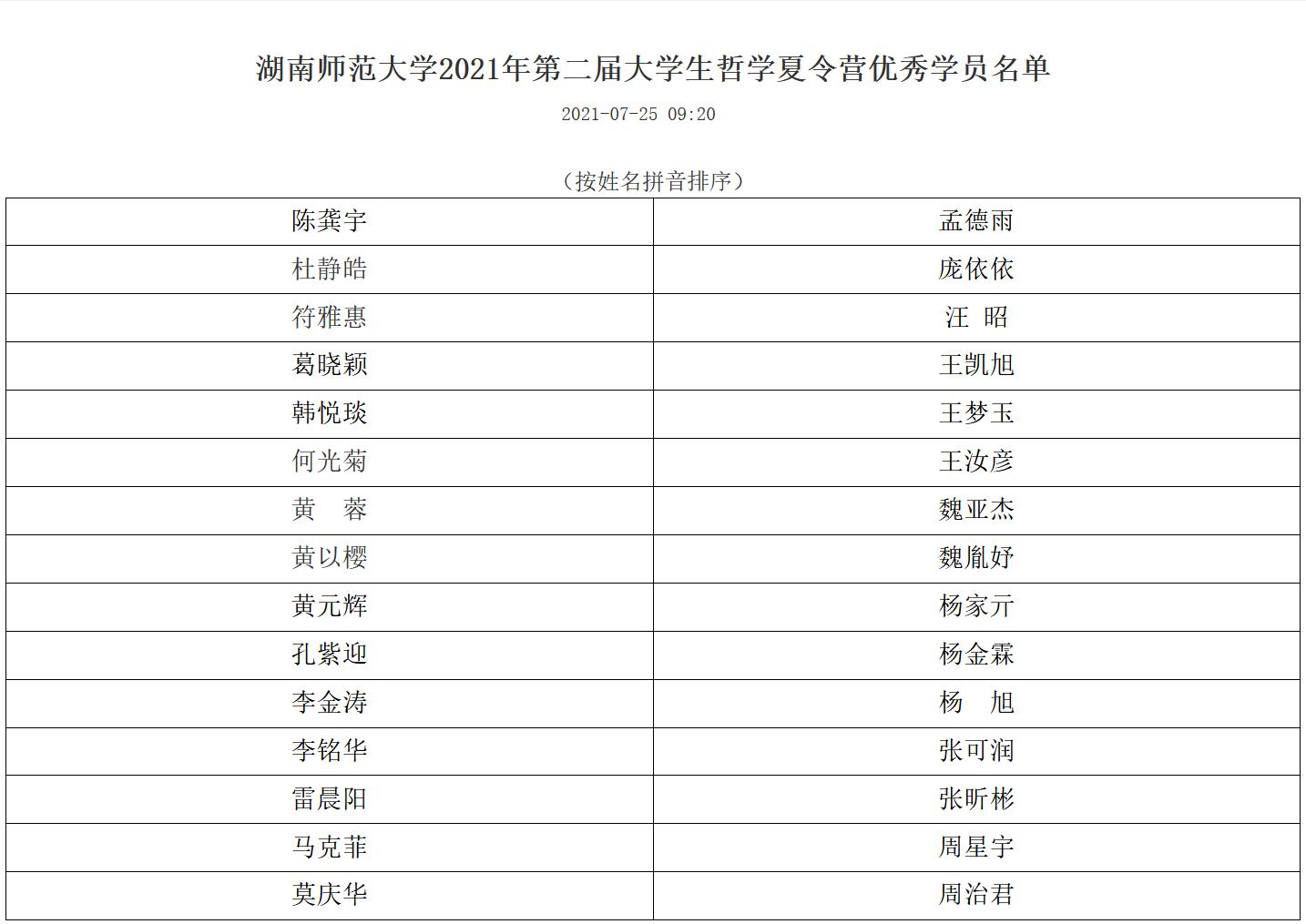 总之,湖南师范大学第二届哲学夏令营经过持续一周高强度、高品质的学术活动,让学员们收益颇丰,产生了良好效应,赢得了大家好评,达到了深化大学生对哲学的体认、增进哲学学术交流、预选拔有志趣有潜质从事哲学研究的优秀学子进入湖南师范大学哲学系深造的目的。在此,衷心感谢学校、学院有关领导的指引和推动!尤其感谢哲学系各位老师和同学的辛勤付出与无私奉献!十分感谢学员们的积极参与和良好回馈!希望下一届哲学夏令营办得更好、成效更佳!热烈欢迎全国各地的学子来湖南师范大学哲学系深造、交流!