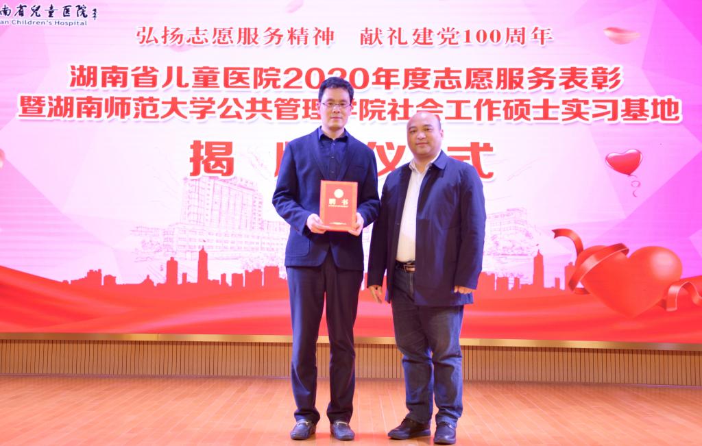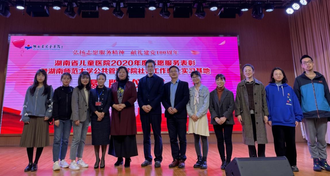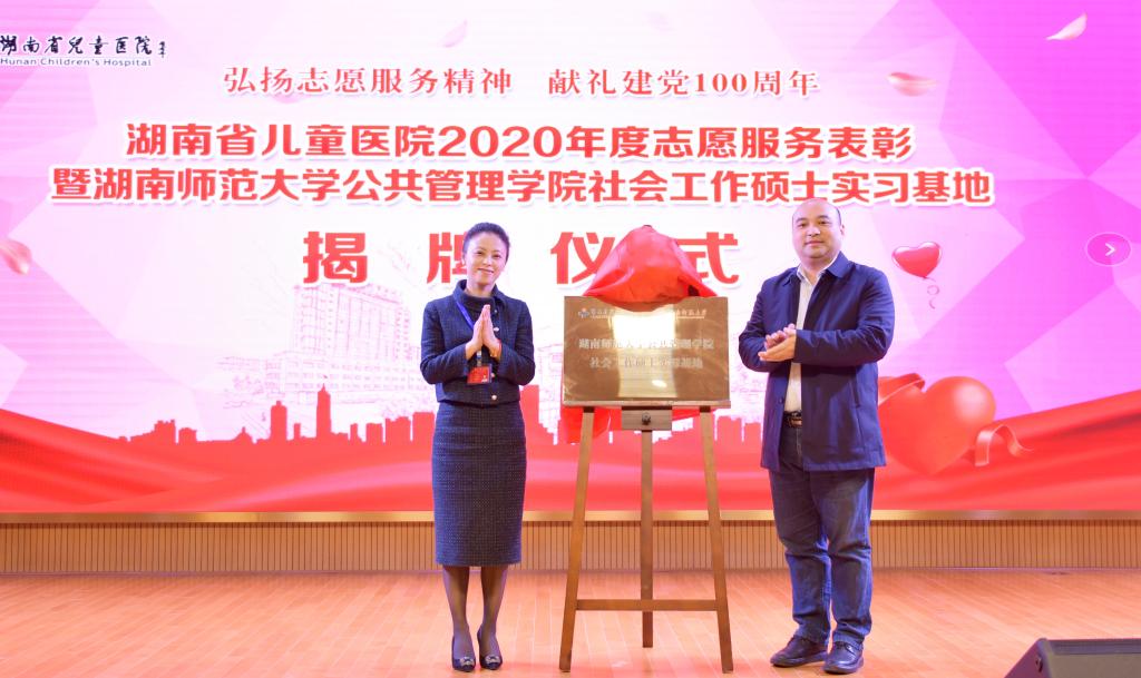 此次揭牌仪式完美落幕,不仅对优秀志愿者们的辛勤付出给予了肯定与鼓励,激发了他们的志愿服务精神,也使现场观众对志愿服务、医务社会工作服务有了更深入的理解,拓展了医务社会工作的学科视野和职业信心。2020年2月23日习近平总书记在统筹推进新冠肺炎疫情防控和经济社会发展工作部署会议上强调“要发挥社会工作的专业优势,支持广大社工、义工和志愿者开展心理疏导、情绪支持、保障支持等服务”。社会工作在疫情防控和医疗服务中的专业优势和积极作用得到越来越广泛的认可和关注。在此情势下,我院与湖南省儿童医院合作共建社会工作硕士实习基地,对推动探索医务社会工作人才培养模式具有积极意义。双方期待精诚合作,共同打造医务社会工作产学研平台,推动湖南省医务社会工作人才培养和专业服务的创新发展。