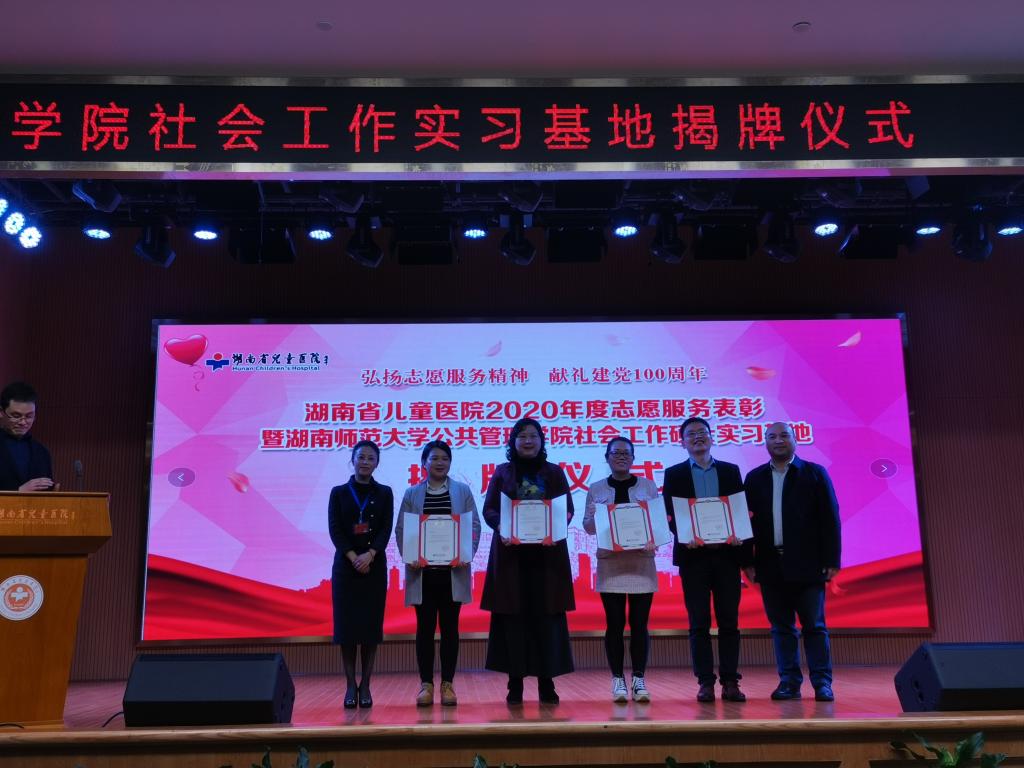 2021年4月2日下午,我院与湖南省儿童医院在其新外科大楼26楼大礼堂隆重举行社会工作硕士实习基地揭牌仪式,在揭牌仪式前湖南省儿童医院还对其2020年度志愿服务先进单位和个人进行了表彰。揭牌仪式由省儿童医院社工部主任王幸主持,省儿童医院党委书记谭李红、工会主席王可为参加仪式。我院副院长李超民、社会工作硕士教育中心主任孙建娥、社会学系冯元博士及部分2020级社会工作硕士研究生和2019级社会学本科生等参加了此次活动。