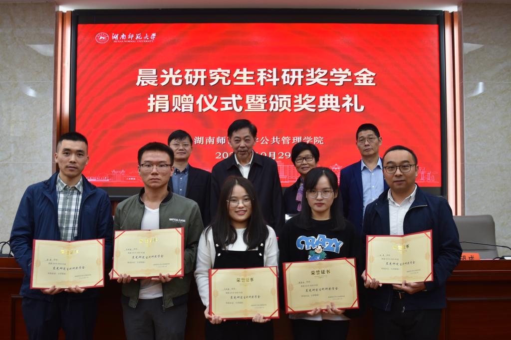 (通讯员宋文艳)2020年10月29日上午,晨光研究生科研奖学金捐赠仪式暨颁奖典礼在博后楼三楼学术报告厅举行。著名党建专家、我校潇湘学者讲座教授徐晨光,教育基金会秘书长杨玲,公共管理学院党委书记余望成,院长毛新志,副院长王敏、赵子林、李超民、邝洁,以及政治学学科的研究生导师代表出席了此次活动。仪式由赵子林副院长主持。