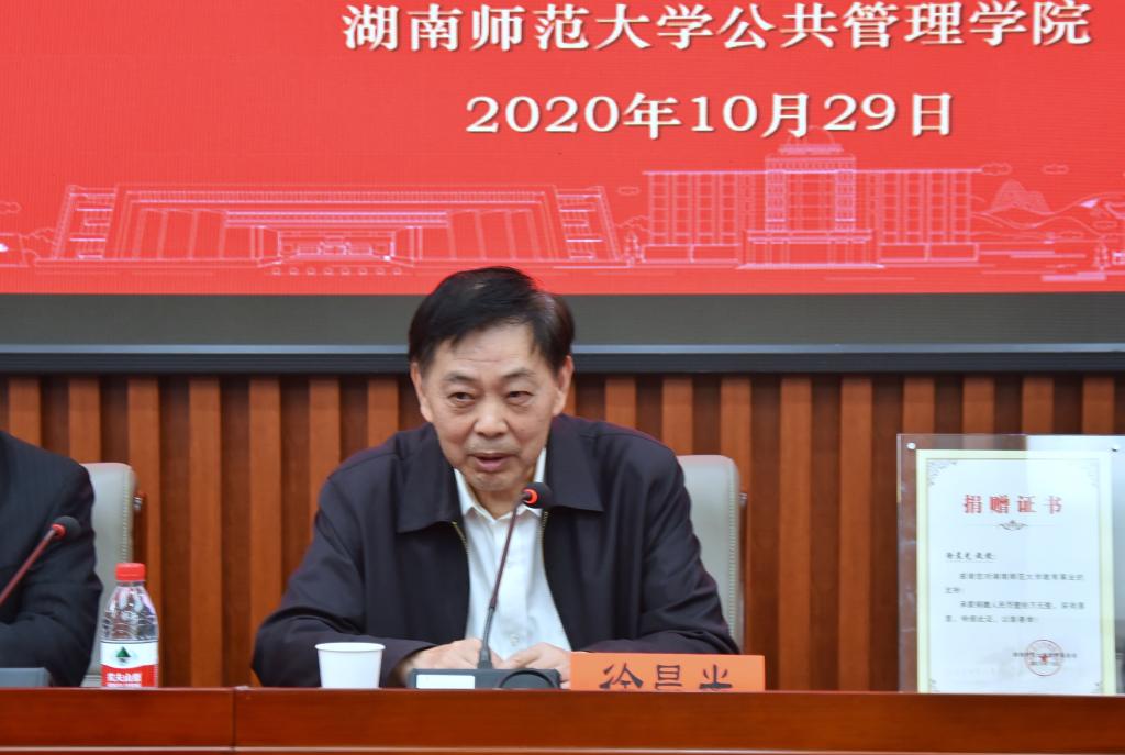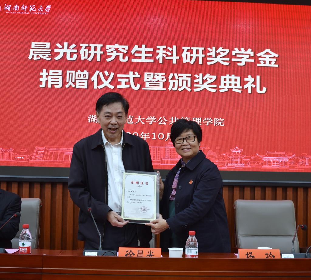 捐赠仪式上,徐晨光教授捐资十万元在公共管理学院设立晨光研究生科研奖学金,用以奖励研究生的科研创新。毛新志院长代表公共管理学院接受了捐赠,杨玲秘书长转达了刘起军校长和周俊武副校长对徐晨光教授的感谢,并向徐晨光教授颁发了捐赠证书。
