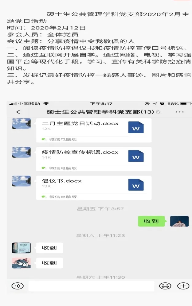 公管院研究生各党支部和广大党员积极响应学校号召,各党支部进行了线上主题讨论,通过线上会议和学习强国视频会议等形式组织同学们积极学习防疫知识,分享疫情中党员的先进事迹,并主动开展了爱心募捐活动,力所能及地传递着温暖与感动。其中,哲学学科党支部的何礼广利用自己所学知识,建立了简易防控预警模型,应用于战“疫”实践;思政学科党支部的李倩用一纸家书传达了对作为医生奔赴抗疫一线的嫂子的敬佩与牵挂——“家人尚好,等你凯旋”,我们相信有爱就会赢!社会工作学科党支部的贺真也在家书中向一个个平民英雄致敬,纸短情长,道不尽感谢,祈盼疫情早日结束;来自社会工作党支部的郭蓉和队友卡点值守、张贴宣传、巡查引导,挨家挨户讲解疫情防控知识。社会学学科党支部的赵相帅作为村里最小的党员,主动向村支书请缨加入值班工作。哲学学科党支部的胡昊玥为此次疫情创作了一首歌词,歌词中“相信新的相逢会将温暖延续,相信当你归来时会带着初生的爱和希冀”,积极传达了对早日结束这场战役的信心与期盼。