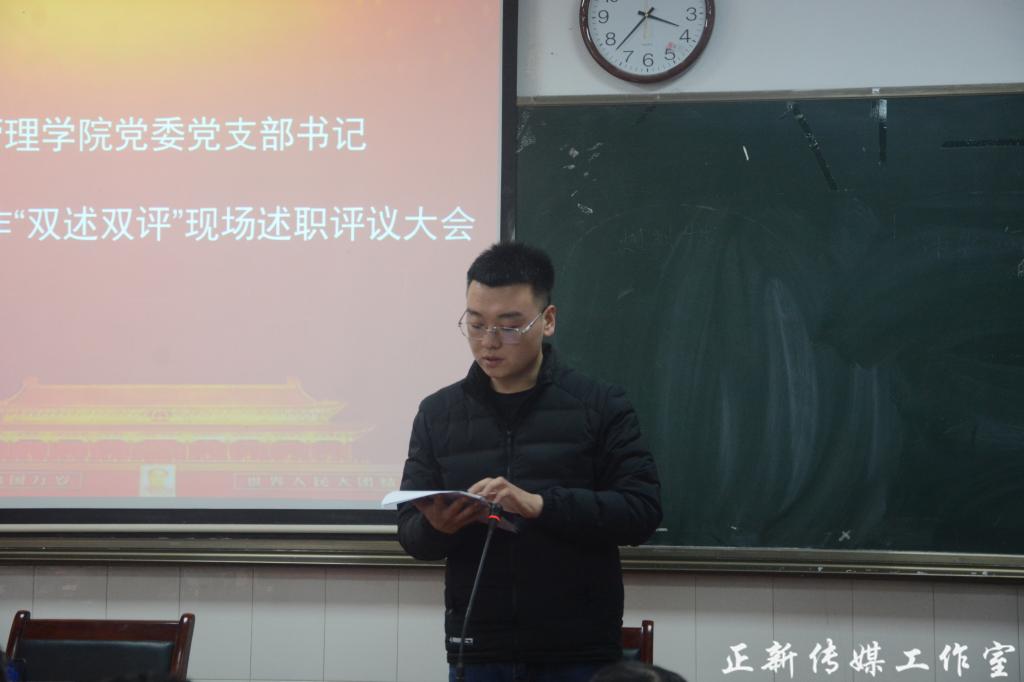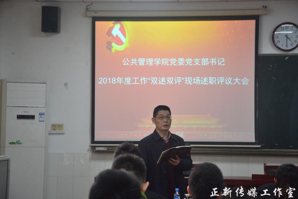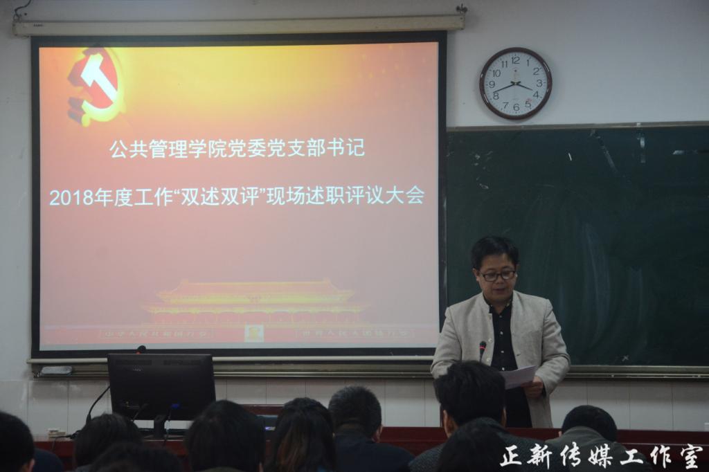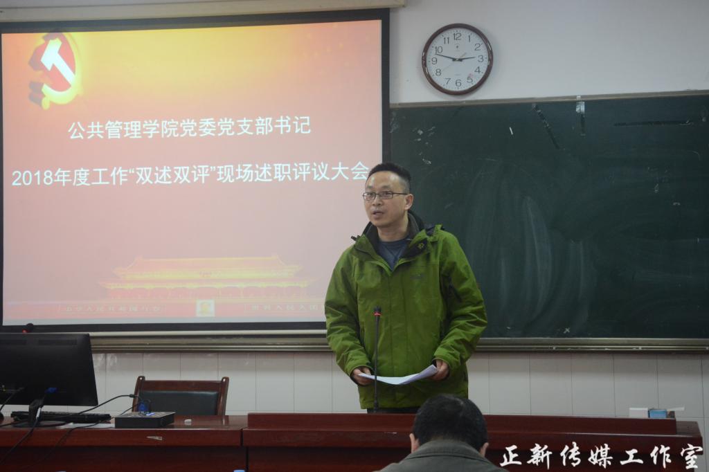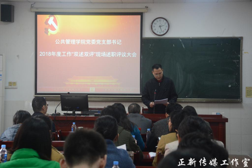 3月28日下午,公共管理学院党委在学院108教室召开2018年度支部书记“双述双评”现场述职评议大会。会议由院党委办主任李江主持。