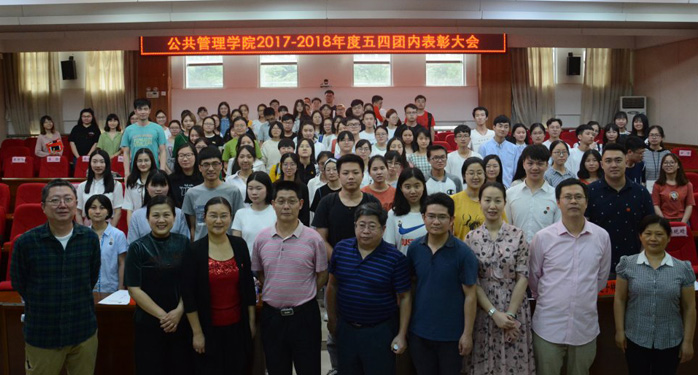 (通讯员 查日成 孙文)5月24日下午,公共管理学院于院学术报告厅举办了2017至2018年度五四团内评优表彰大会。公管院党委书记余望成,党委副书记孙雯波,副院长彭继红、邝洁,党委办主任李江,教务办主任肖大卉,哲学系主任邓名瑛,行政管理学系主任王敏,政治系赵子林老师,学工办主任肖剑,学工办林哲旭、周沐老师以及学生代表参加了此次评优表彰大会。