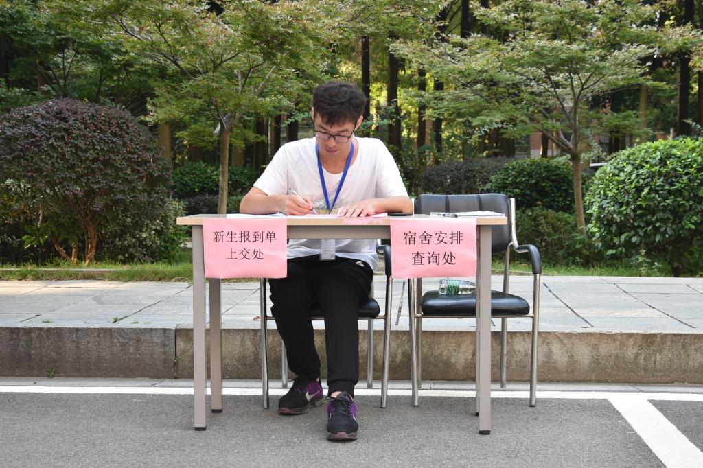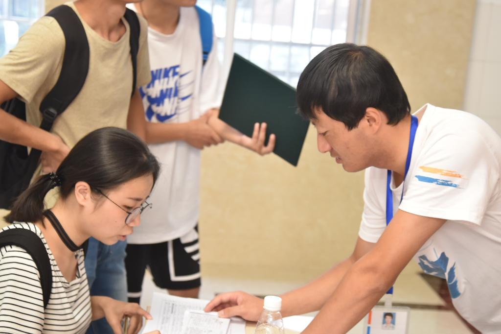 上午7点,新生陆续到达报到地点,领取新生报到单并填写相关信息。同时工作人员对新生进行入学资格审核并现场答疑。