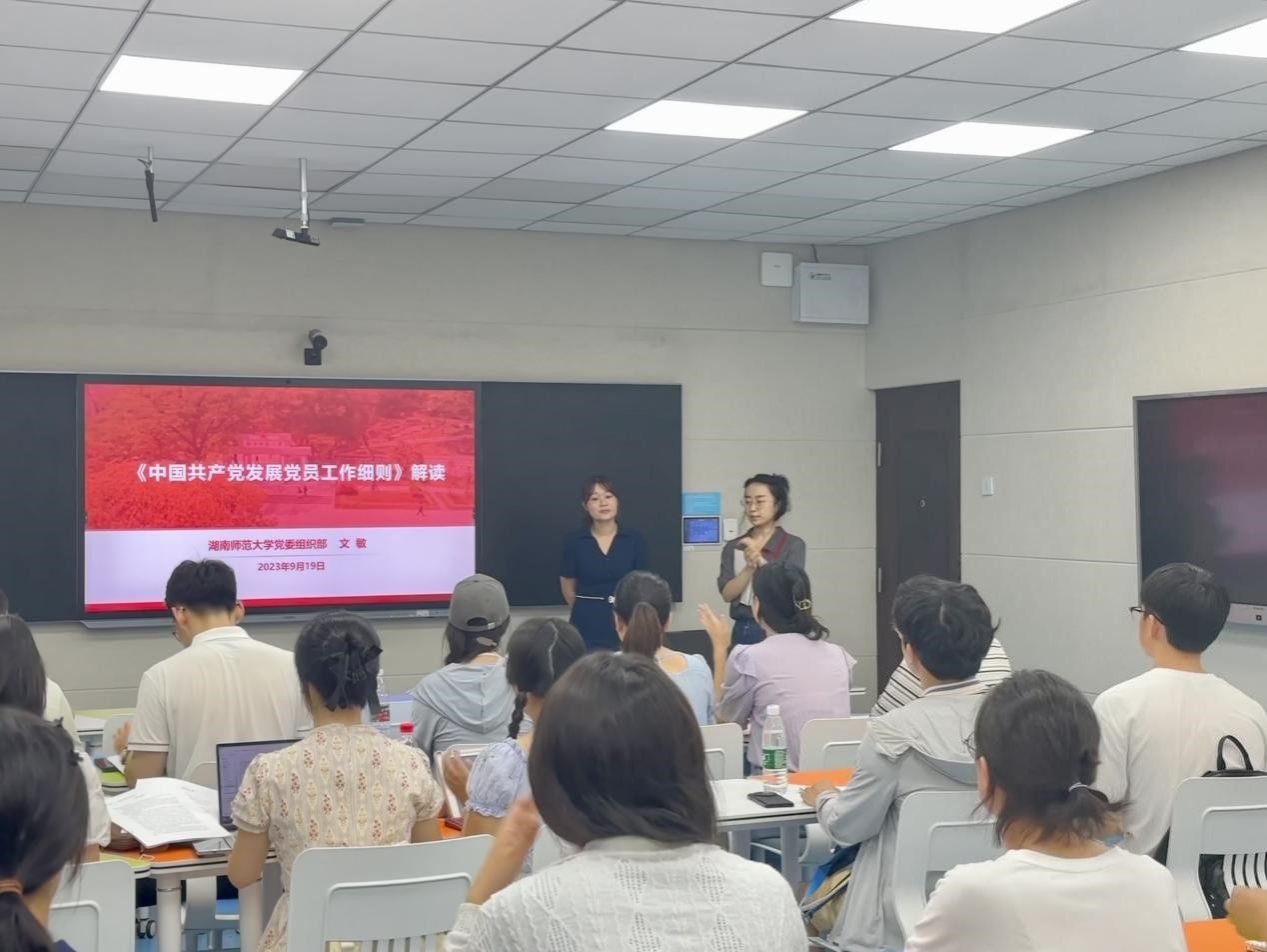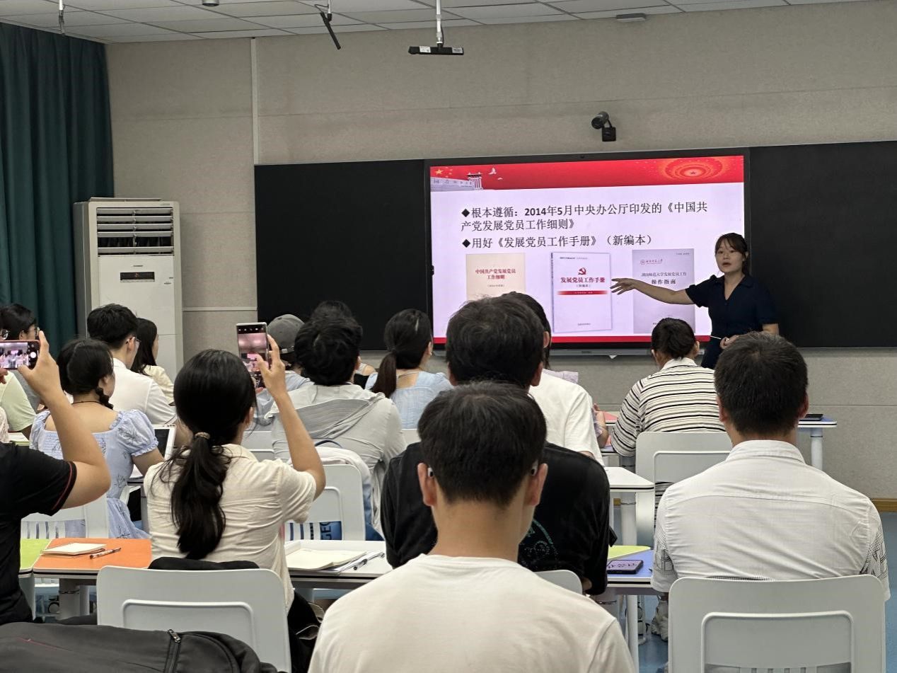 会上,文敏老师以《中国共产党发展党员工作细则》为切入点,就党员发展五个阶段需要具备的条件及时间逻辑、入党材料规范填写和党员档案存档要求等进行了详细解读。同时,她通过实际案例展示指出了党员发展流程和材料填写中容易出现的问题,对易错的时间节点和关键环节进行了梳理强调。