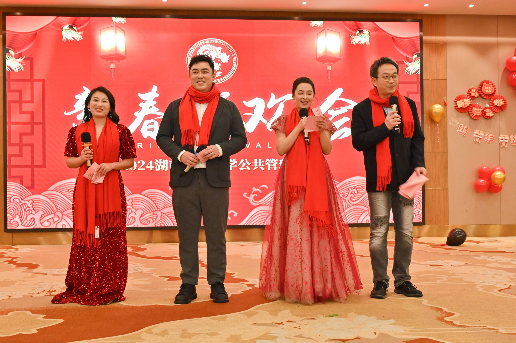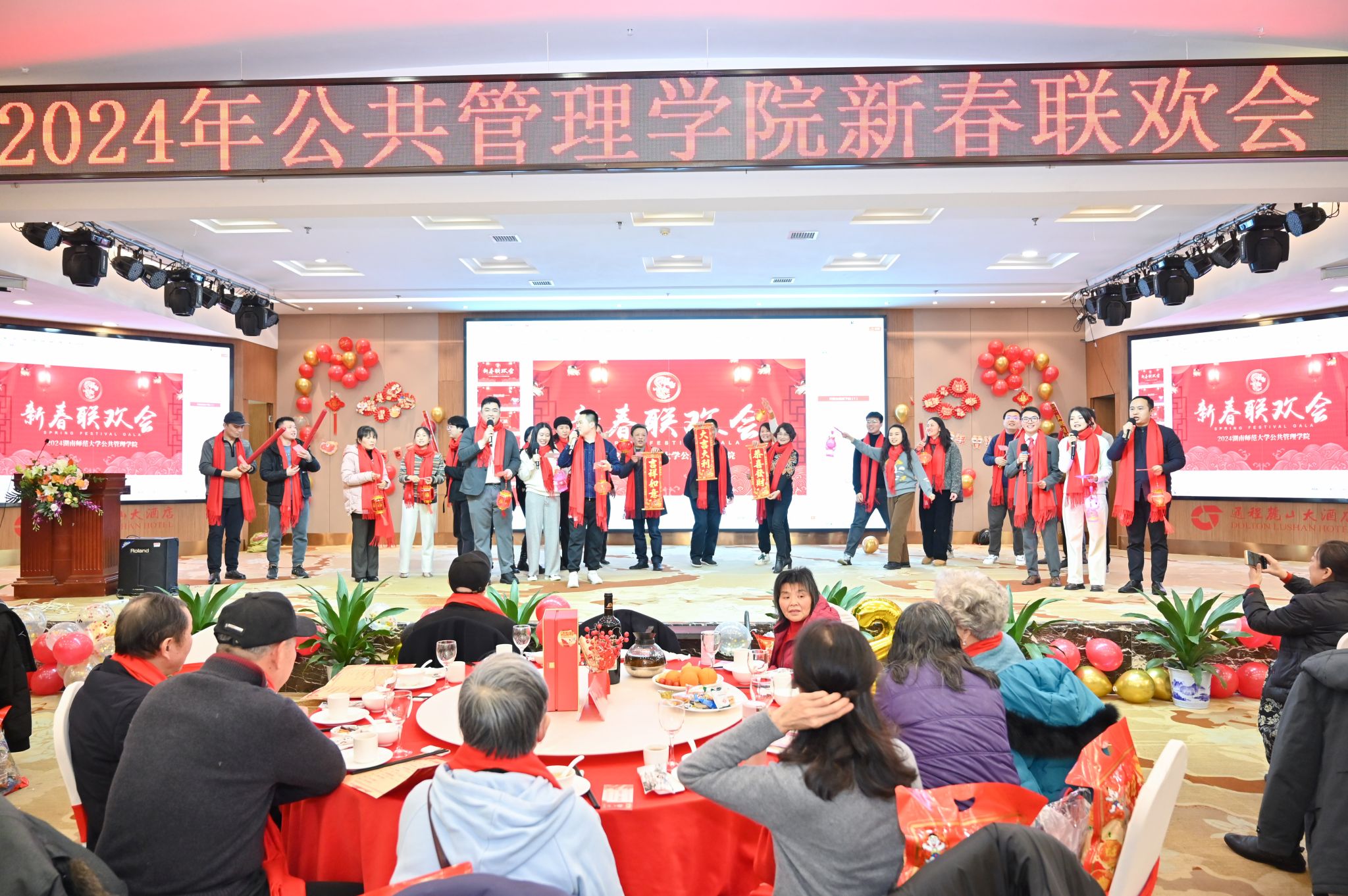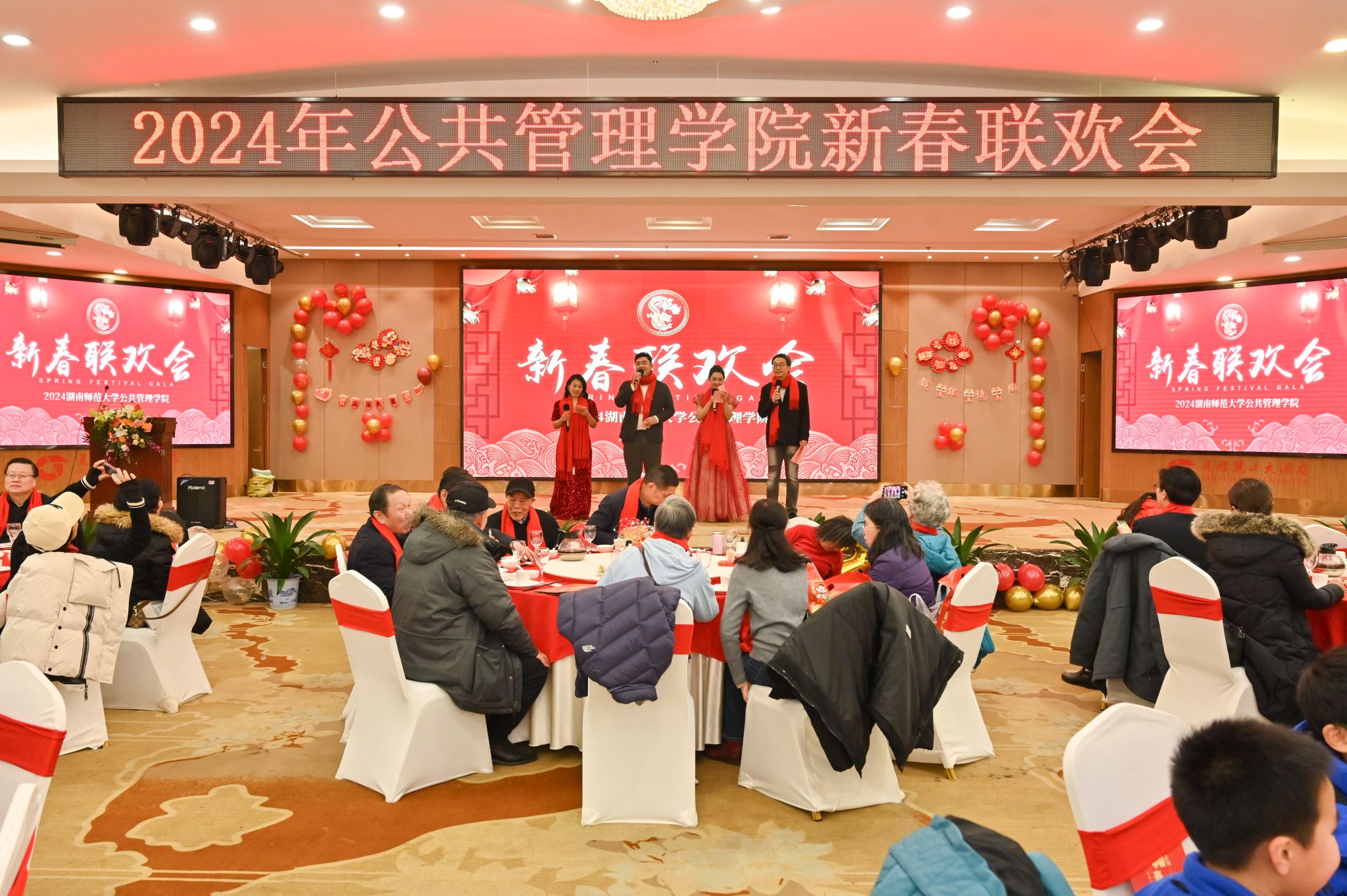 1月19日,公共管理学院130余名在职教职工与离退休教职工在通程麓山国际大酒店湘江宴会厅举行2024年“和美师大 日新公管”新春联欢会。
