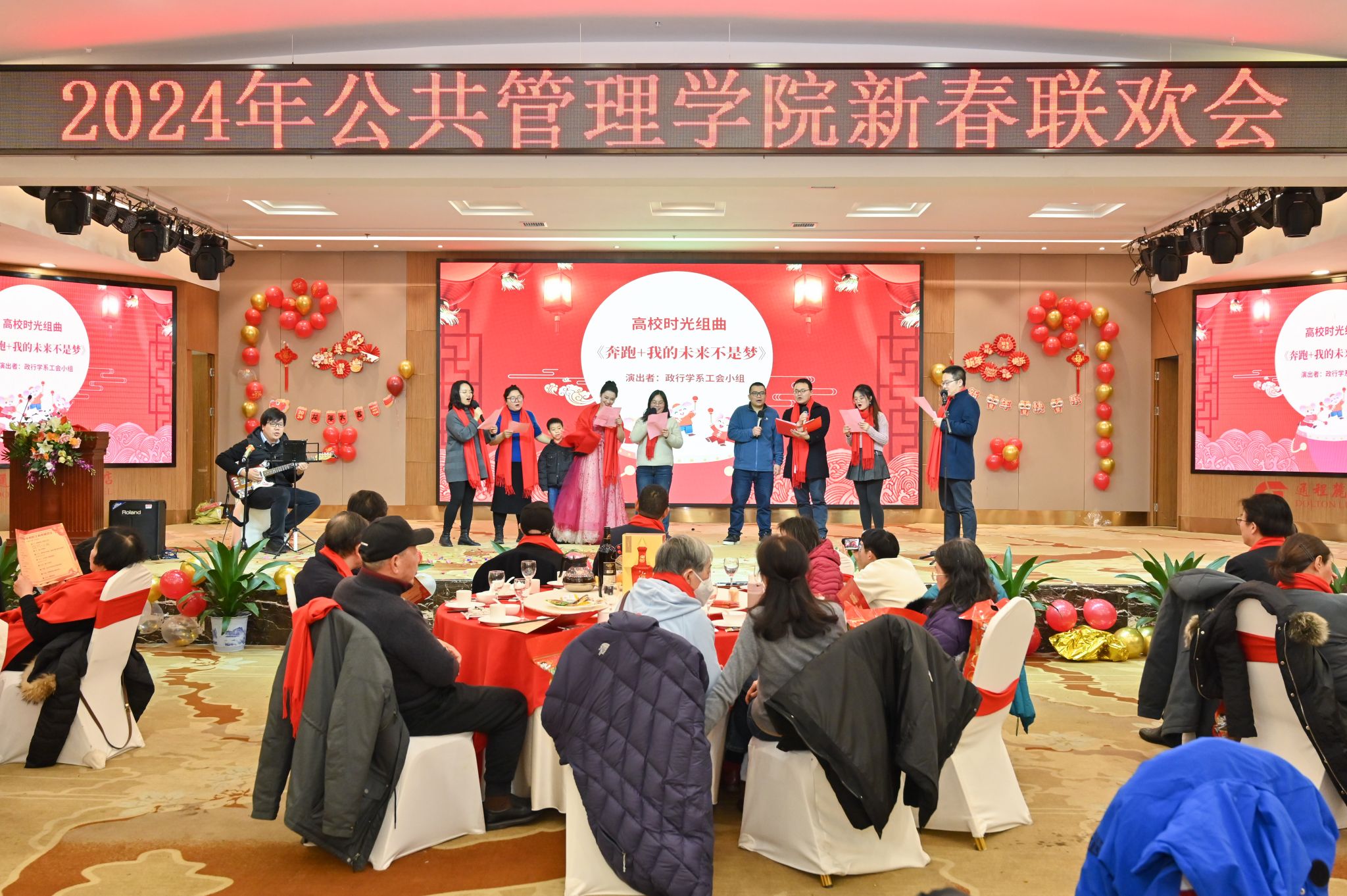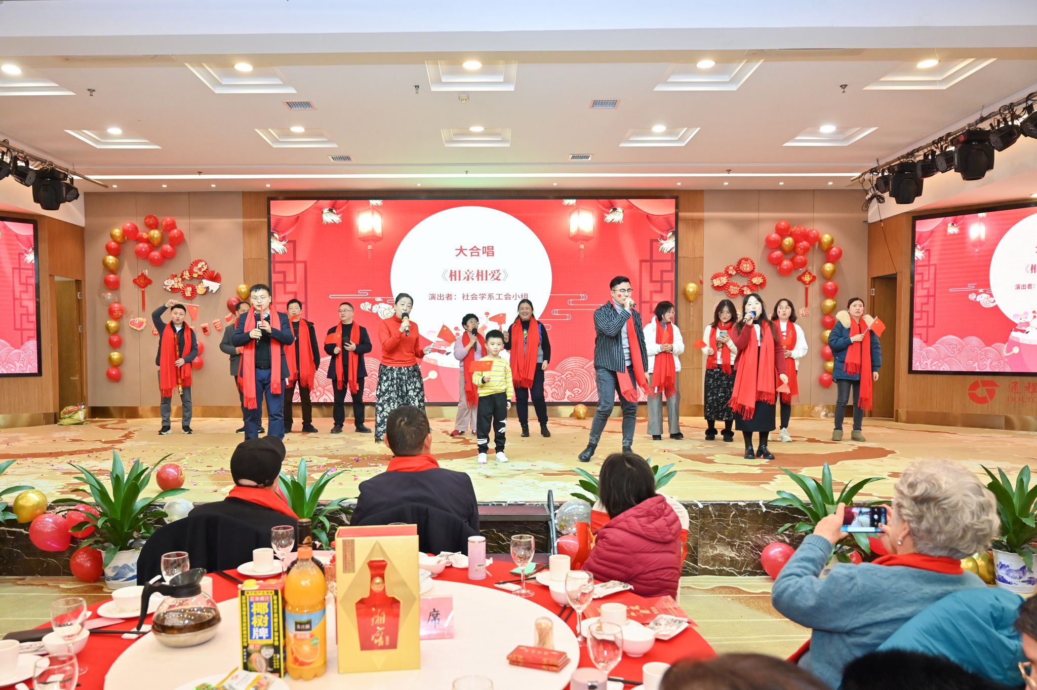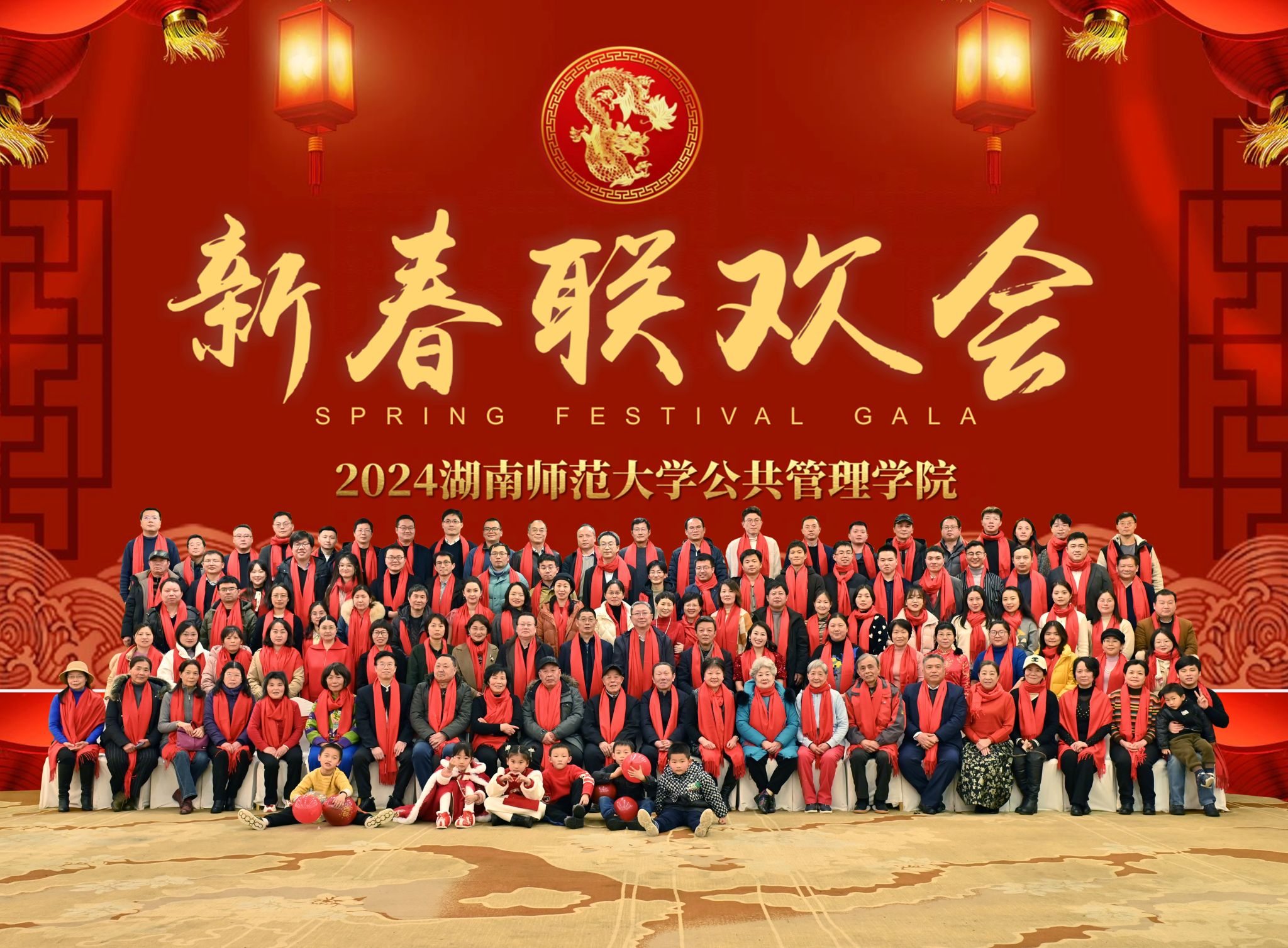 1月19日,公共管理学院130余名在职教职工与离退休教职工在通程麓山国际大酒店湘江宴会厅举行2024年“和美师大 日新公管”新春联欢会。