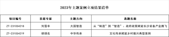 近日,教育部学位与研究生教育发展中心、中国专业学位案例中心公布2023年主题案例征集评审结果,其中我院胡扬名教授主持的《文化传承赋能乡村振兴典型案例》荣获“中华传承”主题立项、刘雪丰教授主持的《从“制造”到“智造”:政府政策赋能长沙装备产业腾飞》荣获“大国智造”主题立项。