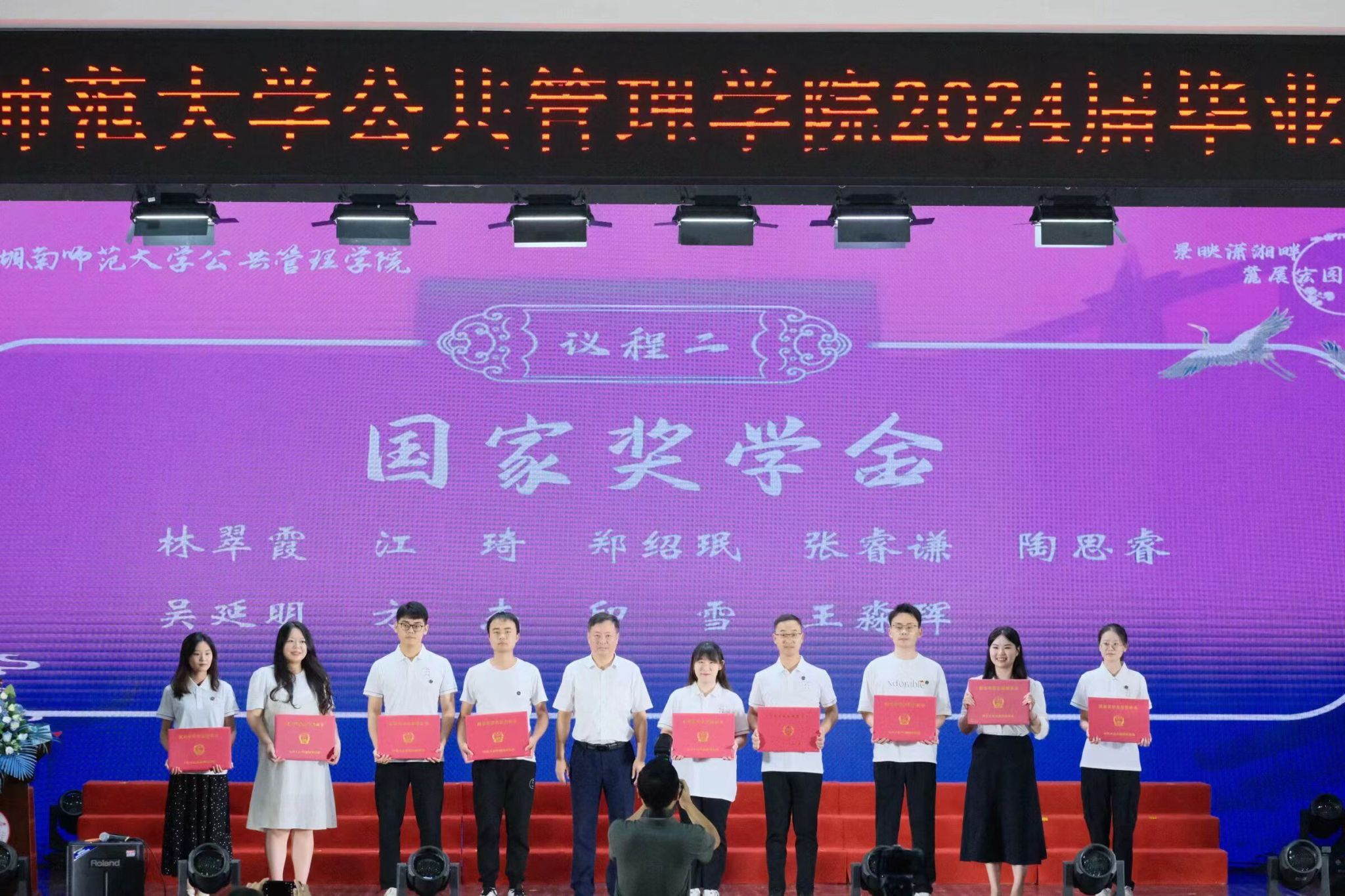 余望成宣读了国家奖学金、2024届湖南省优秀毕业生、2024届湖南师范大学优秀毕业生等奖项的获奖名单以及2024届毕业研究生和本科生校友联络员的聘任名单。王辉副校长等领导老师依次为获奖人员颁奖并合影留念。