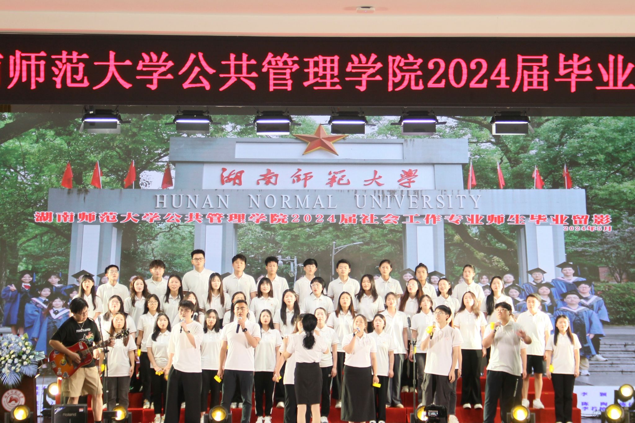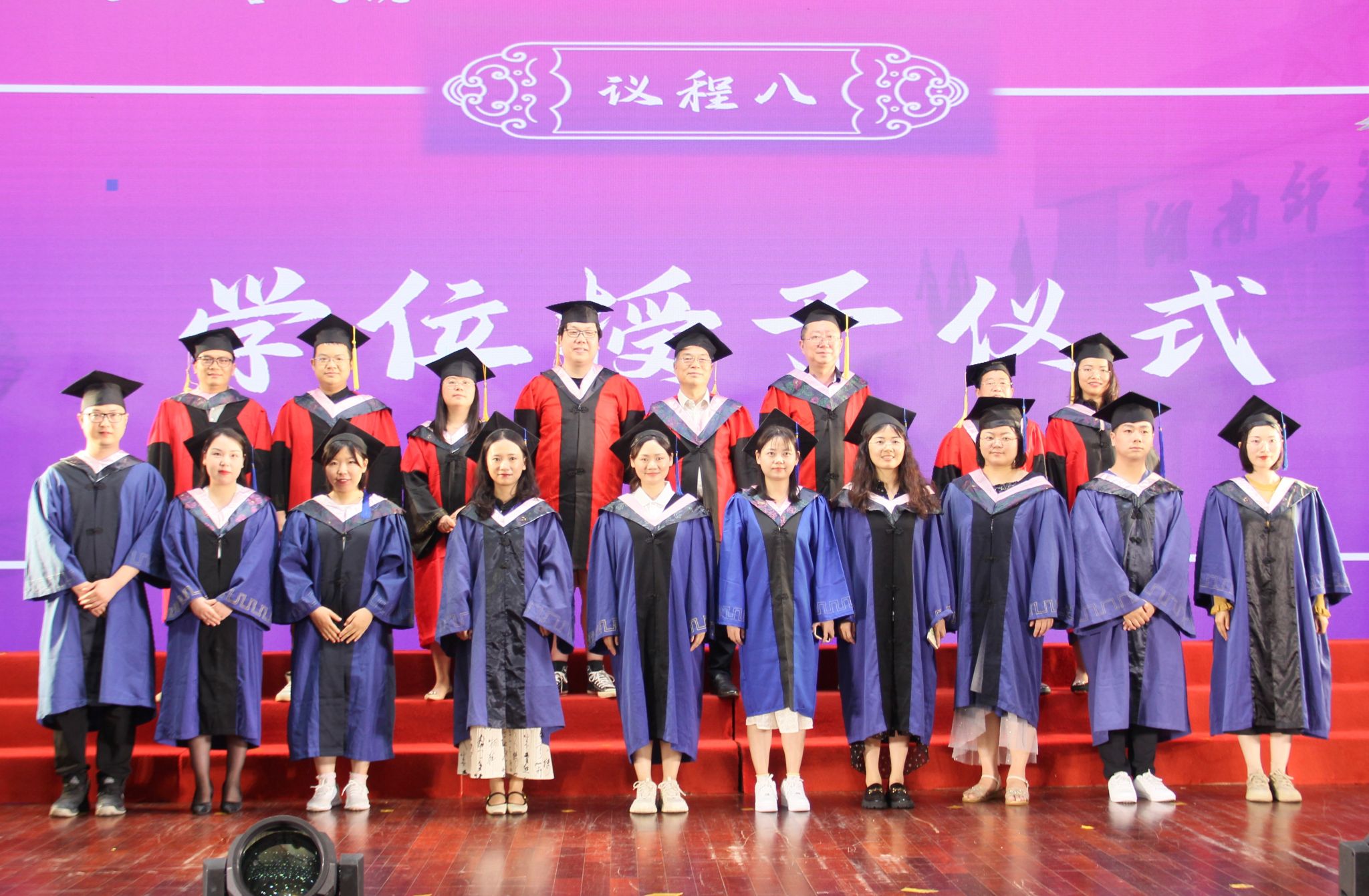 师生合唱歌曲《稻香》后,毕业生们依次上台,由导师进行拨穗。全体师生进行合影留念。