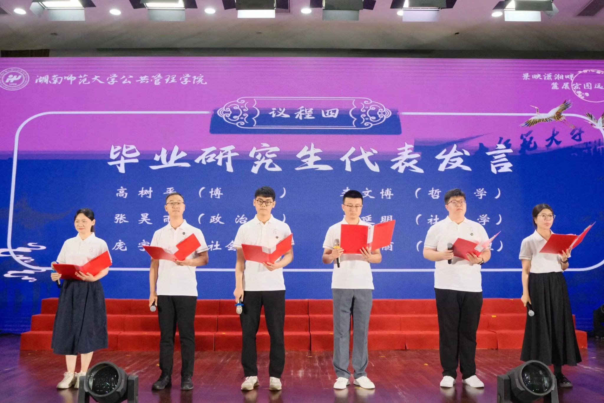 研究生和本科生代表分别上台进行发言。研究生代表高树平等人结合亲身经历,向学院和老师的悉心指导和辛勤培养表示由衷的感谢,同时表达了对未来的展望;本科生代表李莹等人回顾了四年成长经历,表示要继续坚持并发扬“正大日新”的院训,将所学所见所悟植根于实践。毕业生代表的发言展现出公管学子昂扬奋进的精神面貌。