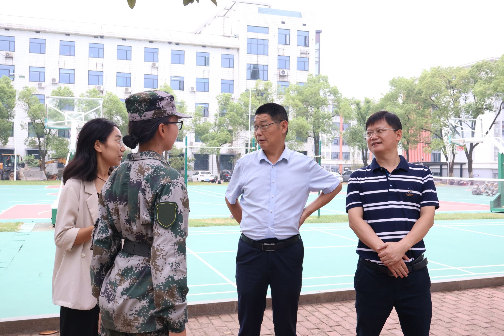 余望成和毛新志首先向教官询问新生训练的内容,通过与教官的交流,他们了解了军训进展情况。随后,领导们深入训练场地,分别视察第一、第二方阵的训练过程和新生们的表现。在休息时间,余望成肯定了2024级新生这段时间军训的训练成果,并对接下来的训练作出指导。他勉励同学们坚定意志,不断进步,把正步踢得更加利落,把队列走得更加整齐,展现公管学子的风采。孙雯波对同学们表示关心问候,她对教官、军助和同学们这段时间付出的辛苦和努力表示鼓励和赞许,并希望同学们能够保持身体健康,珍惜军训时光,强化集体意识。