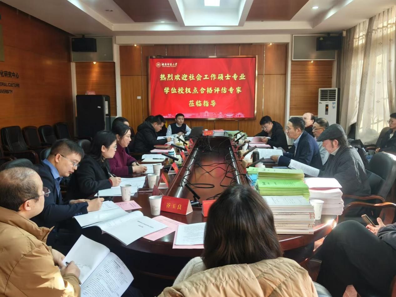 12月15日上午,湖南师范大学社会工作硕士(MSW)专业学位授权点自评阶段专家现场评估会在景德楼中栋415举行。全国社会工作专业学位研究生教指委委员、中国社会工作学会秘书长邹学银教授任专家组组长,专家组成员还有原教育部高等学校教学指导委员会社会学类专业教指委委员、中国青年政治学院社会工作系主任陈树强教授,全国社会工作专业学位研究生教指委委员、西北师范大学哲学与社会学院院长李怀教授,中国社会工作教育协会实务专委会副主任、湖南省社会工作协会名誉会长史铁尔教授,湖南省雅医医务社会工作中心副理事长、湖南师范大学校聘实践导师陈哲博士。会议由湖南师范大学公共管理学院党委书记余望成主持。公共管理学院院长毛新志教授、研究生办胡耀飞老师、MSW教育中心主任孙建娥教授以及师生代表参加了评估会。