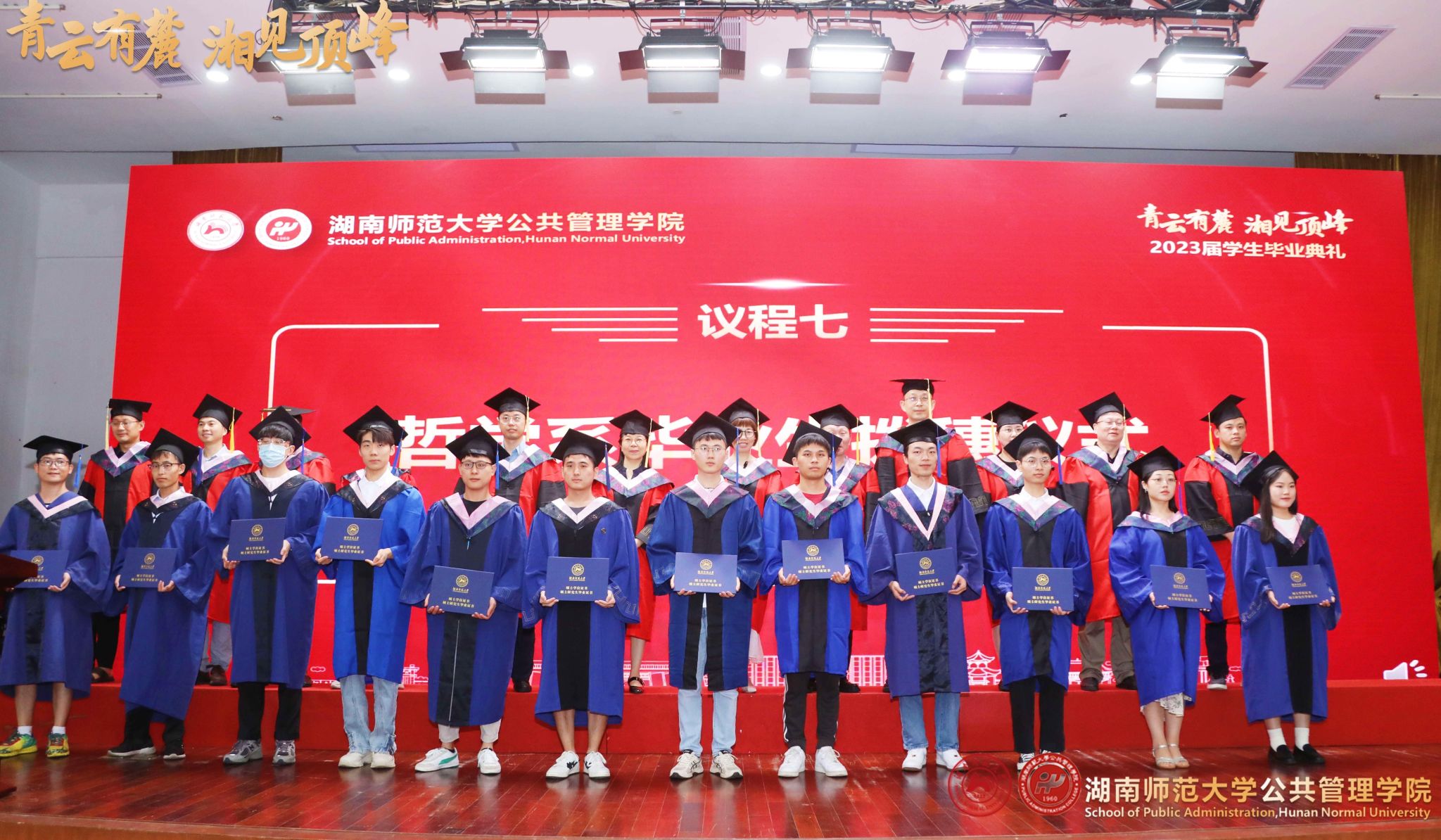 (通讯员 兰绍娴 金志敏 曾靖雯)6月16日下午,公共管理学院“青云有麓,湘见顶峰”2023届毕业典礼暨学位授予仪式在湖南师范大学国际学术报告厅隆重举行。学院党委书记余望成主持毕业典礼。湖南师范大学副校长王辉,校友总会副秘书长邝洁、贺慧星,社科处副处长李超民等学校和职能部门负责同志;公共管理学院院长毛新志,道德文化研究院院长兼哲学系系主任向玉乔,院党委副书记孙雯波,主管科研副院长、政治学一级学科学位点负责人王敏,主管本科教学副院长苏静,主管行政副院长胡雪松,道德文化研究院副院长文贤庆,社会学系系主任、社会学一级学科学位点负责人罗忠勇,政治学与行政管理系系主任何琴等学院和学系负责人;哲学一级学科学位点负责人张怀承、政治学科科学社会主义博士点负责人周小毛、社会工作专业硕士点负责人孙建娥、MPA专业硕士点负责人刘茜等学位点导师代表以及本科毕业生班导师、研办和学工办的老师出席毕业典礼。
