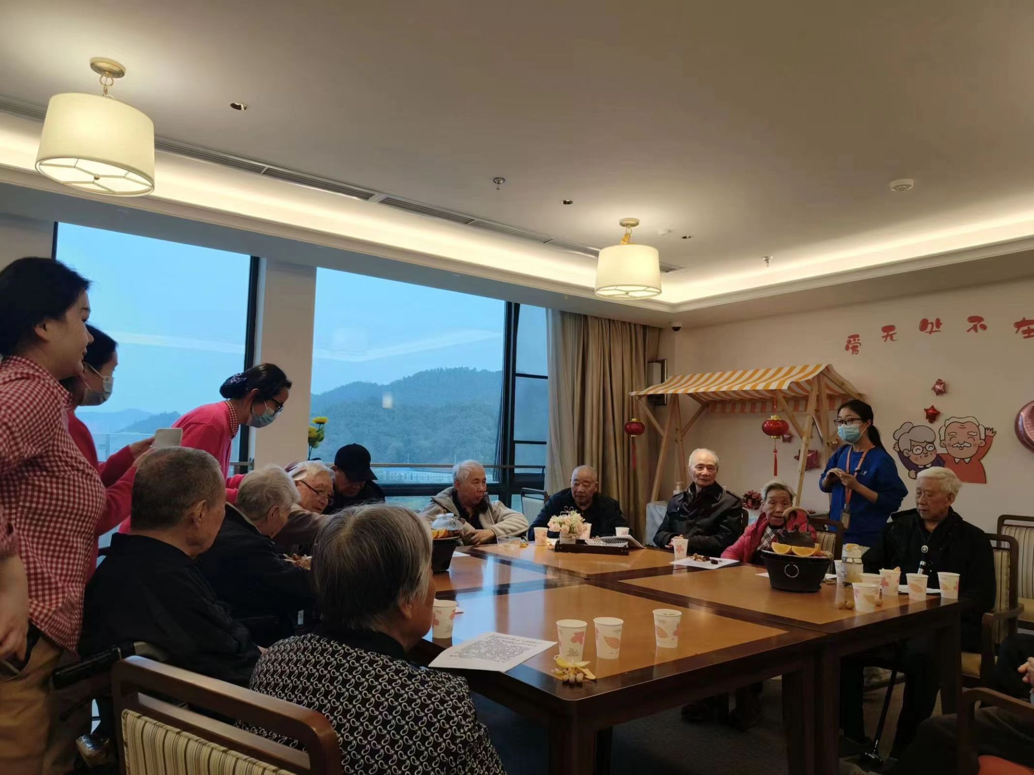 志愿者们向老年人们介绍活动内容