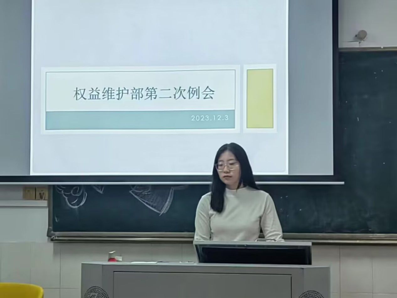 (通讯员 刘智政 魏楚松 王嘉潼)12月3日中午,为总结部门前期工作经验,保障部门后续工作的顺利开展,公共管理学院(以下简称”公管院“)学生会权益维护部于景德楼中栋109教室召开第二次部门例会。参会人员有学生会权益维护部部门负责人张佳怡,权益维护部志愿者负责人王鸣聪、魏楚松及八名23级志愿者。