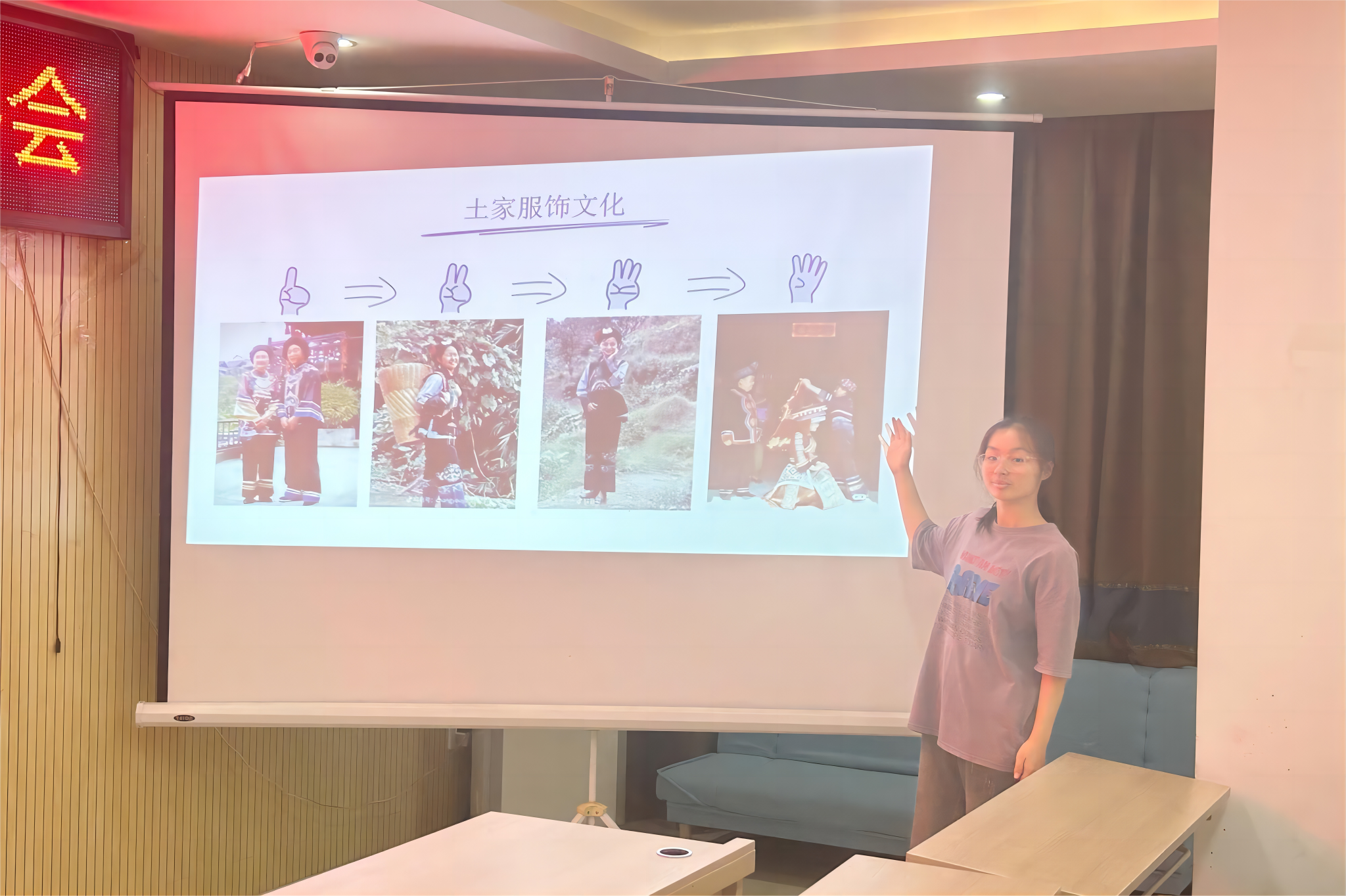 在中国少数民族服饰文化课上,胡元浈从形成原因、象征意义、保护传承等方面介绍少数民族服饰文化,并鼓励同学们课后自主了解一项少数民族服饰文化。