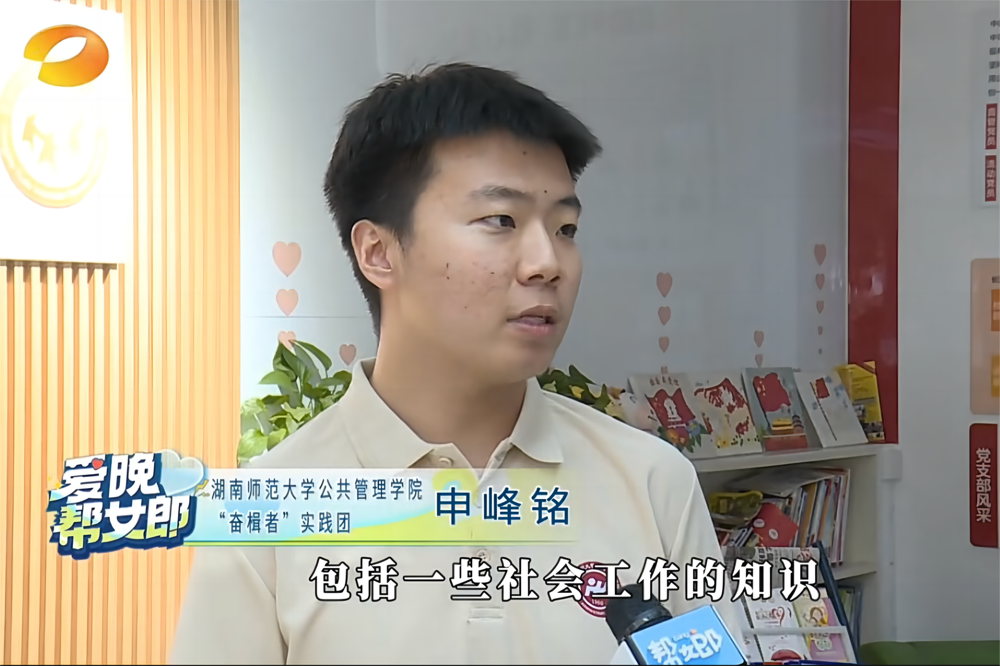 (通讯员:黄帅 王蕊 刘剑)7月15日上午,我校马克思主义学院讲师罗帅、公共管理学院辅导员申峰铭、长沙市暖心社工综合服务中心理事长周平,公管院“奋楫者”实践团(以下简称“实践团”)成员左诗饶、李广浩接受湖南广播电视台爱晚频道“爱晚帮女郎”栏目(以下简称“爱晚频道”)的采访。