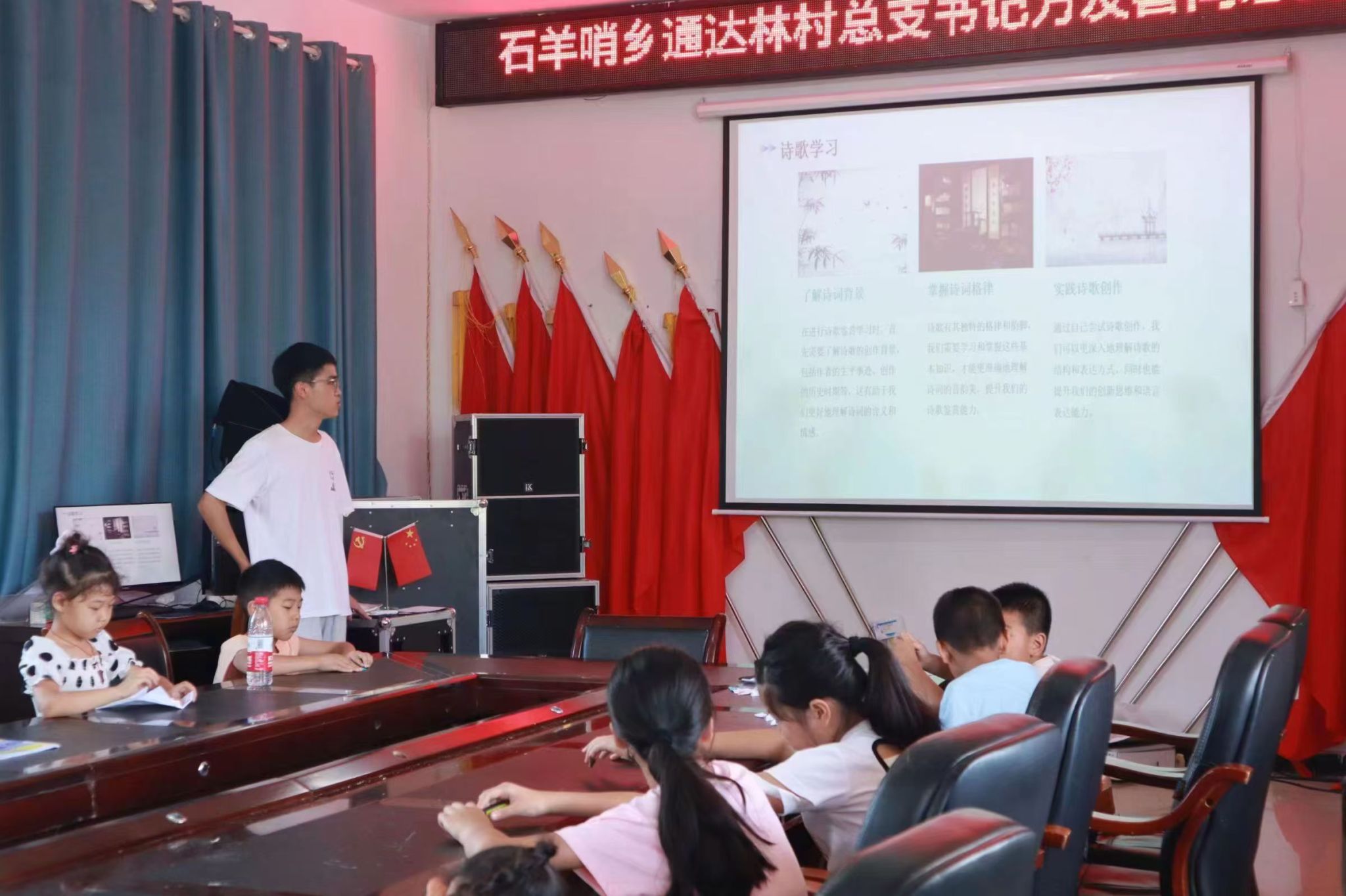在开展诗歌小课堂的过程中,实践团成员以介绍诗歌历史为切入点,向孩子们讲述学习诗歌、走进诗歌的意义与价值,让他们意识到诗歌学习的重要性和必要性。接着,实践团成员组织了有关诗歌的小游戏,通过“组字成句诗词”“飞花令”两个活动检测孩子们诗词积累量与知识掌握程度,锻炼他们的反应能力。同时,实践团成员在课堂上播放了一段《中国诗词大会》飞花令比拼的精彩视频,让孩子们深刻感受到中华优秀传统文化之美。