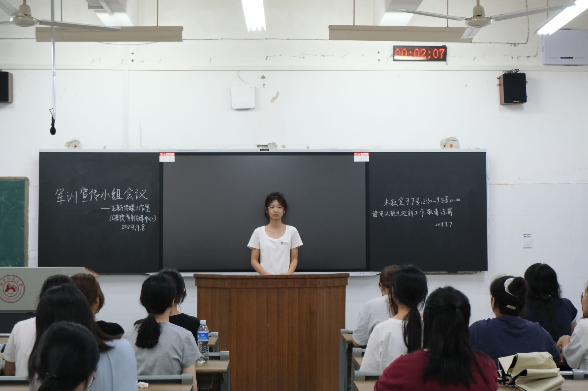 会议伊始,公管院青年传媒中心主任康婕,副主任金博雅、杨昊及其他有关小组负责人进行了自我介绍,并表示了对新成员们的热烈欢迎。各小组成员们依次进行了自我介绍,这使彼此之间有了一定的了解。在会议上,康婕重点强调了军训宣传小组成员在工作期间的注意事项。她表示成员们应严格遵守军训期间的各项纪律和规定,统一有序地按照安排开展工作。同时军训宣传小组成员们还应秉持严谨认真的工作态度,展现公管学子应有的的良好形象与素质。最后,康婕表达了对各成员戮力同心、共同完成军训宣传工作的期待。
