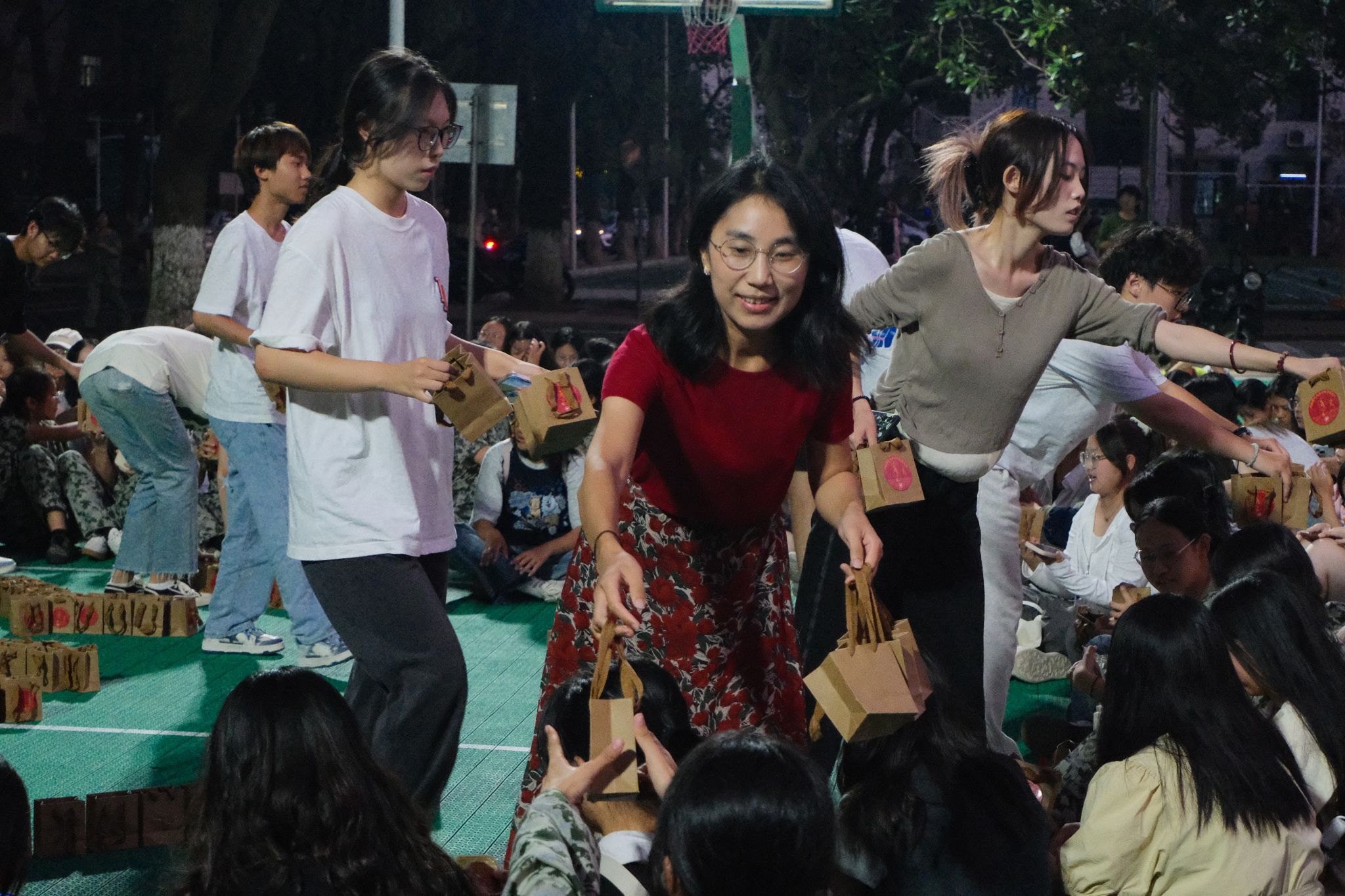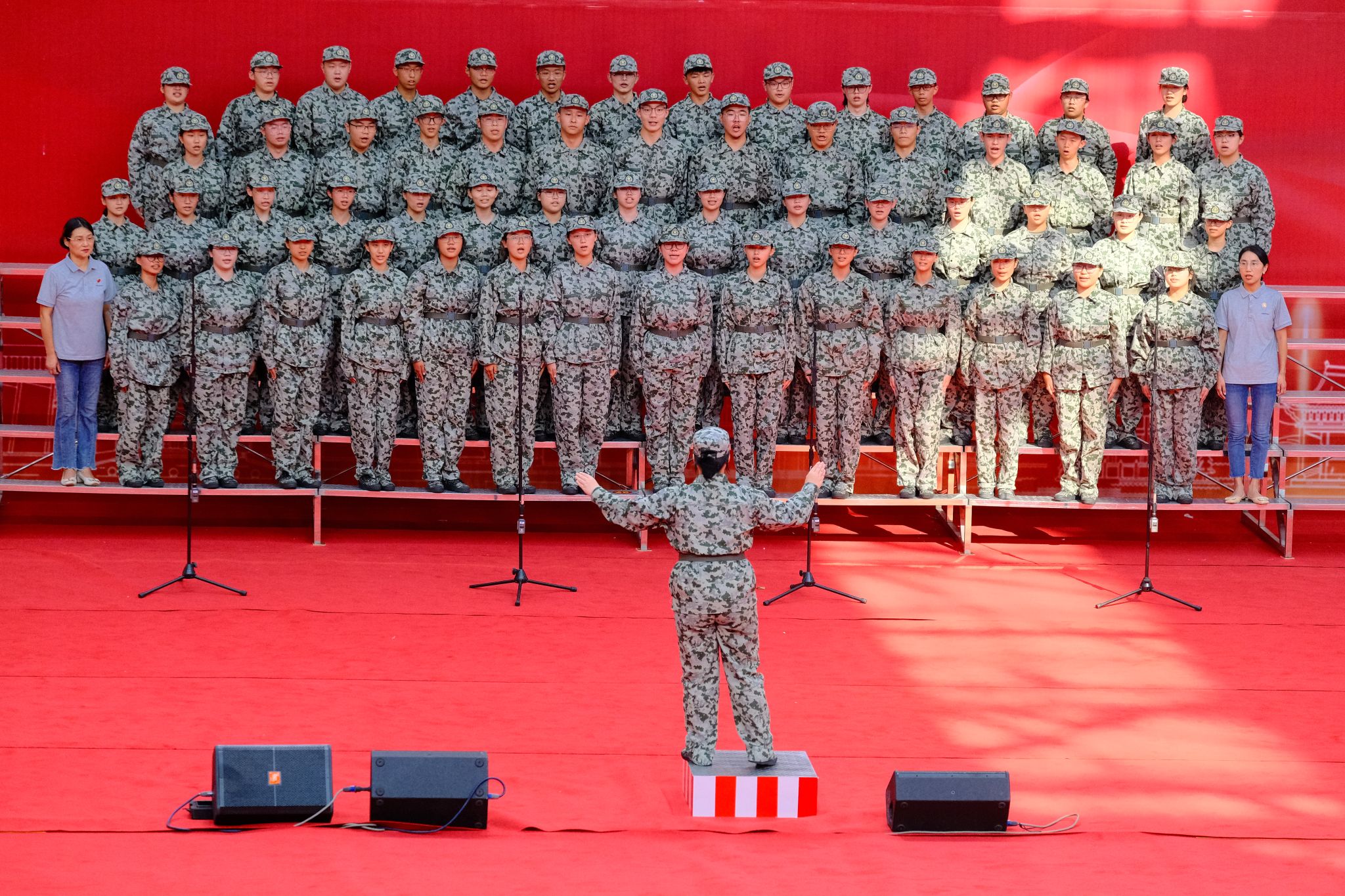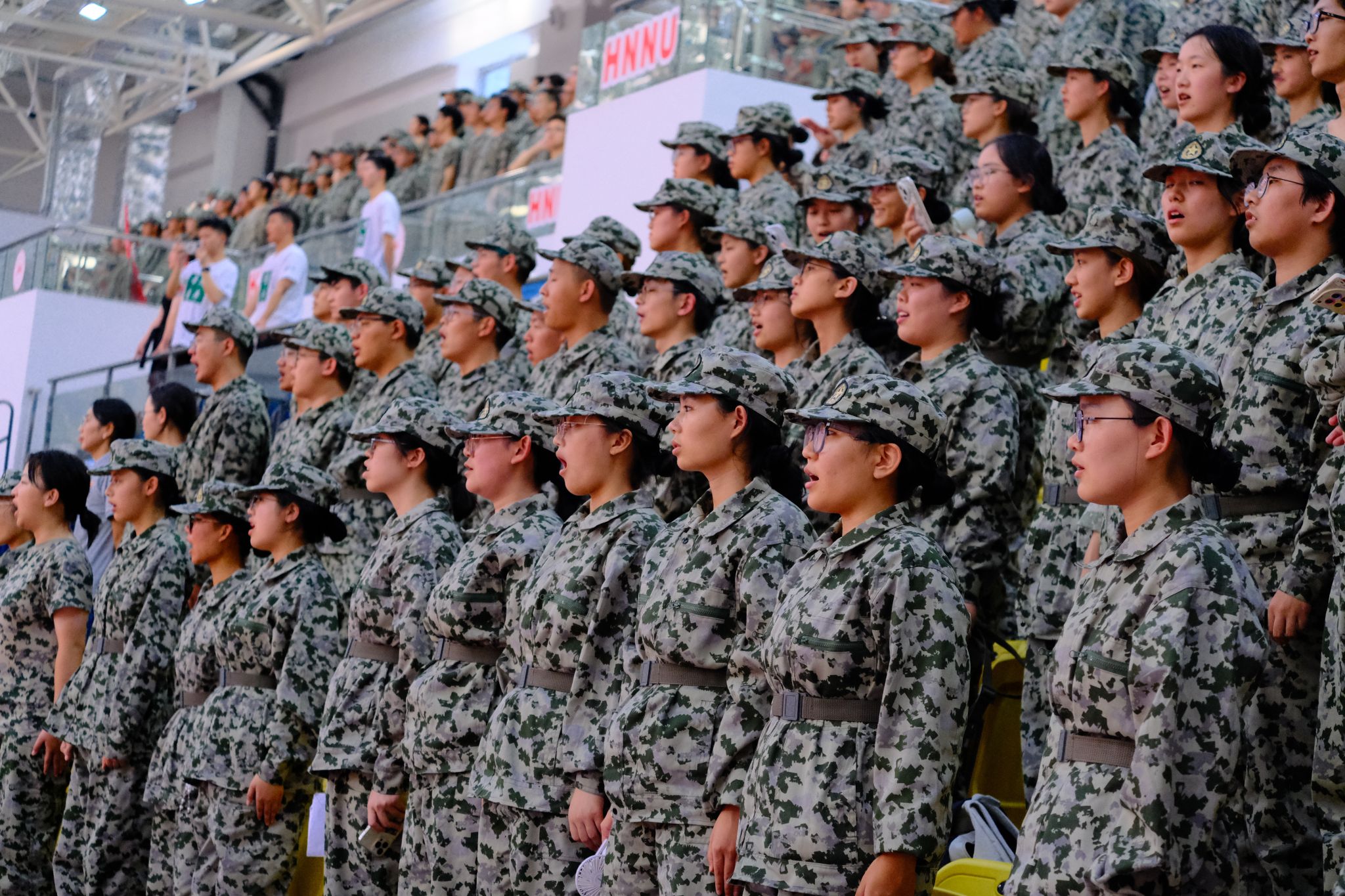 在主持人的报幕后,同学们站好位置,合唱比赛正式开始。此次公管院军训合唱团合唱的曲目是《当那一天来临》。同学们铿锵有力的声音在江湾体育馆响起,他们唱出了军训队伍的激情和力量,歌声传达出了同学们强烈的爱国情怀和对理想的追求。孙雯波和夏瑞霞分别站在军训合唱团两侧,增添了公管院军训合唱团的斗志和气势。