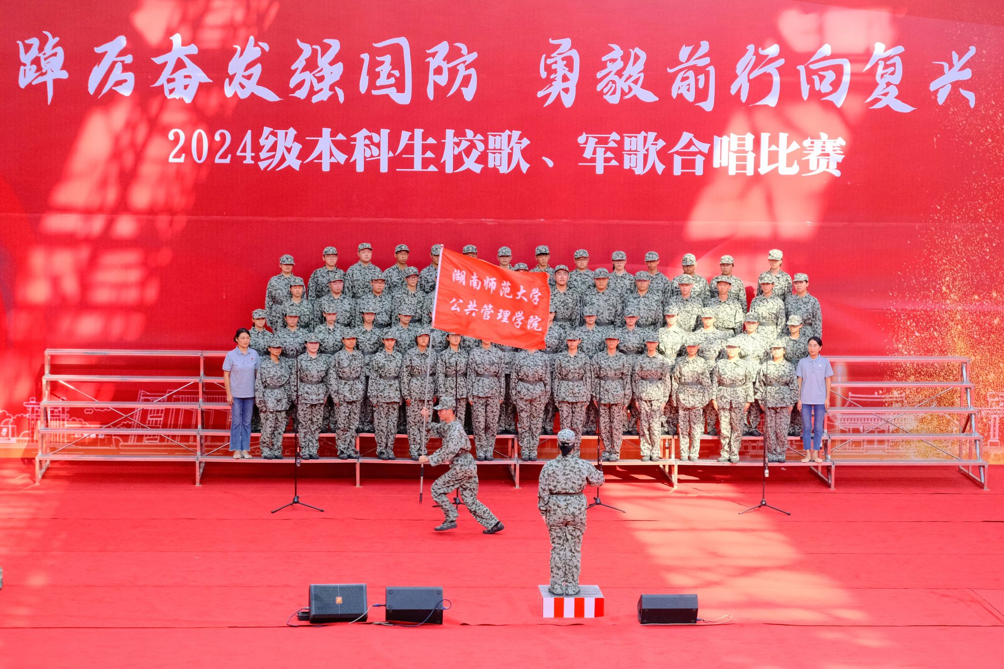 (通讯员:周涵韵 康婕)为展示新生精神风貌,坚定理想信念,弘扬爱国主义精神,由公共管理学院(以下简称“公管院”)2024级本科生组成的军训合唱团于9月18日在江湾体育馆参与了主题为“踔厉奋发强国防 勇毅前行向复兴”的校歌、军歌合唱比赛。公管院党委副书记孙雯波、2024级本科生辅导员夏瑞霞为此次合唱比赛助阵。