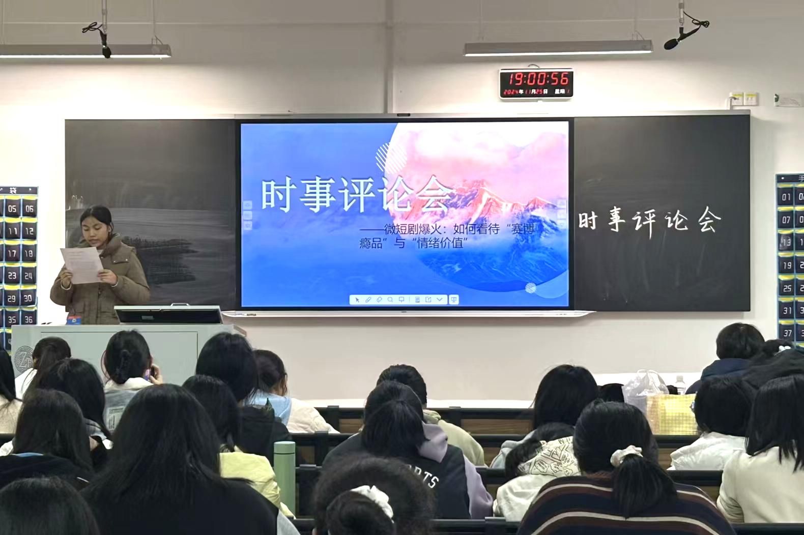 (通讯员:董雨娇 朱曼丽 席子坤)为了培养公共管理学院(以下简称“公管院”)学子的思辨精神,引导同学们学会阐述观点、表明态度,11月25日晚,公管院青年传媒中心青年评论部(以下简称“青评部”)与学社管子非鱼思辩社于桃花坪校区实训楼402教室举办“微短剧爆火”时事评论会。此次活动由青评部相关负责人朱曼丽主持,参与人员包括青评部全体成员、子非鱼思辩社部分成员及40余名公管院学生。
