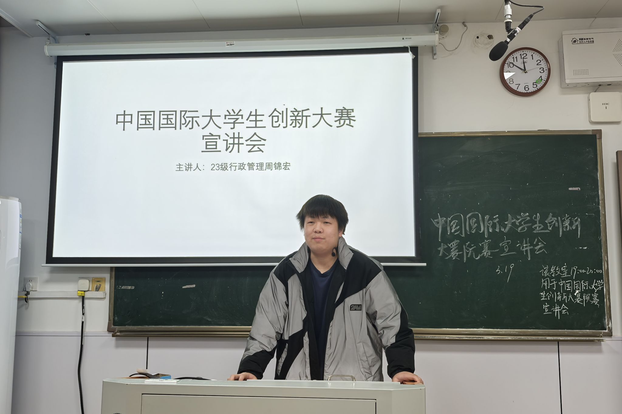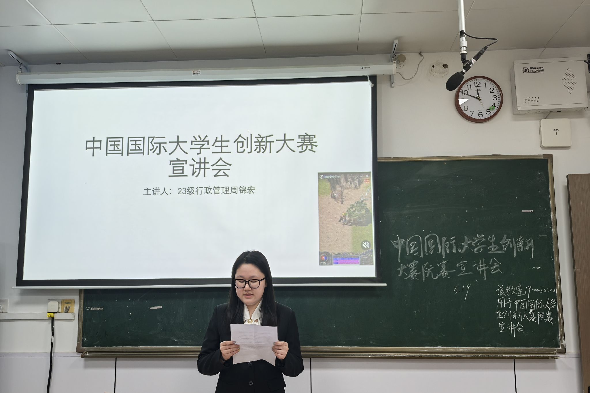 (通讯员 朱辰宇 张树 谭欣雨)为了让同学们了解中国国际大学生创新创业大赛(以下简称“互联网+”)的相关事项,激发青年群体创新精神,提升实践能力,3月19日晚,公共管理学院(以下简称“公管院”)团委青年创新创业指导中心于景德楼中栋111教室举办“互联网+”宣讲会。此次活动由23级行政管理专业周锦宏进行经验分享,24级政治学与行政学专业于汶主持。
