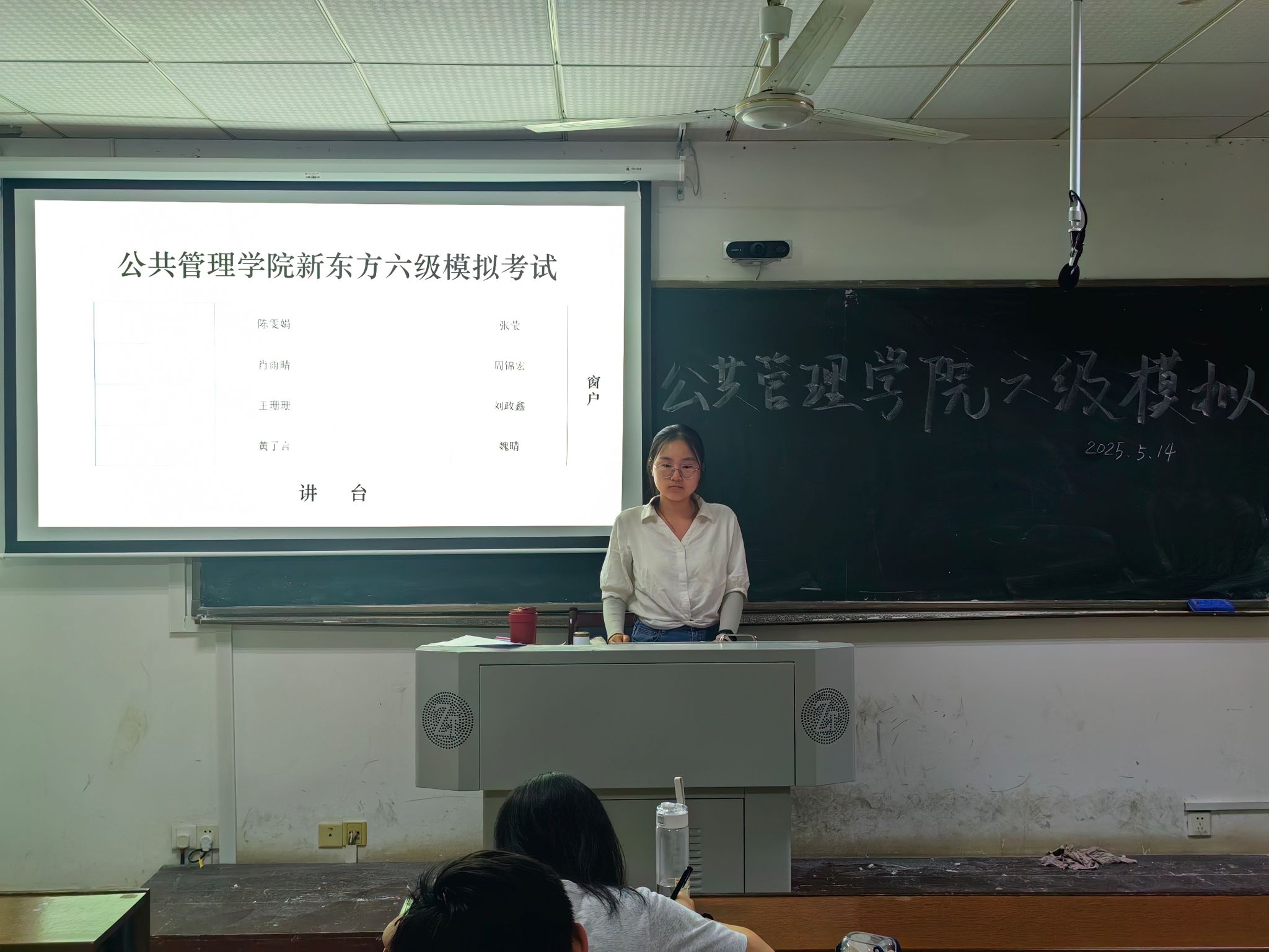 (通讯员 刘剑 樊星 贾馨瑶)为助力学生备考全国大学英语四六级考试,5月14日、19日晚,公共管理学院分别在景德楼312教室、桃花坪校区实训楼303教室举办新东方全真六级、四级模拟考试。公管院2023级、2024级部分同学参与考试。
