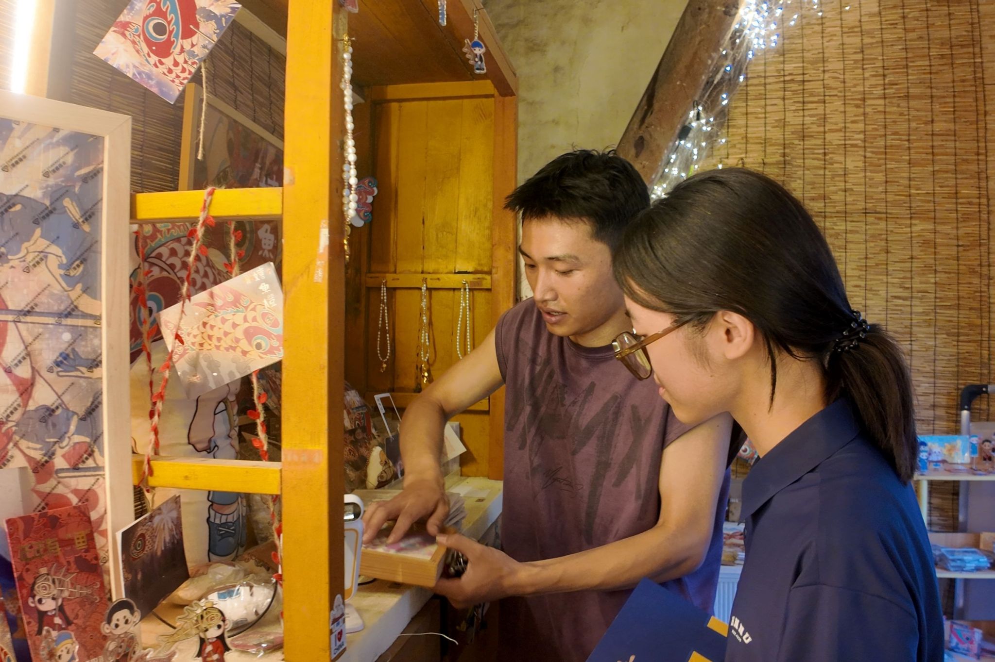 此前,调研团已采访鱼灯非遗传承人汪子超,艺术系学生李笑卉等人,他们均表示支持鱼灯创新性发展、现代化转型,并提供了相关建议。吴凌基带领调研团参观文创店铺、深入了解“鱼灯”文化,据他介绍,鱼灯作为汪满田村传统民俗文化的重要符号,承载着人们对美好生活的向往与祝福。为了让这一古老的非遗文化在现代社会中焕发出新的活力,他组建了专业的设计团队,深入研究鱼灯的历史、造型和寓意,将现代设计理念与传统工艺相结合,精心打造出了这些兼具美观与实用性的文创产品,包括鱼灯明信片、鱼灯绘本、纸质鱼灯等。吴凌基自大学毕业便投身于汪满田村文创事业,耕耘多年独具匠心,力图不断创新鱼灯发展方式,提高非遗鱼灯知名度。