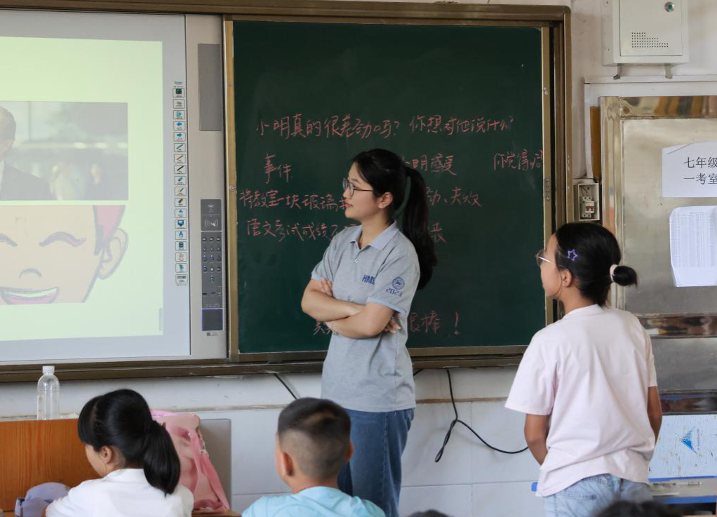 志愿者朱艺菲以《音乐之声》为载体,带领孩子们模仿台词、学唱英文主题曲,通过“音乐+语言”融合教学,训练孩子们英语表达能力;心理健康课上,志愿者赖婕妤以“认识自我”为主题,通过情景短剧演绎,引导孩子们挖掘自身价值,学会接纳与认同自我。