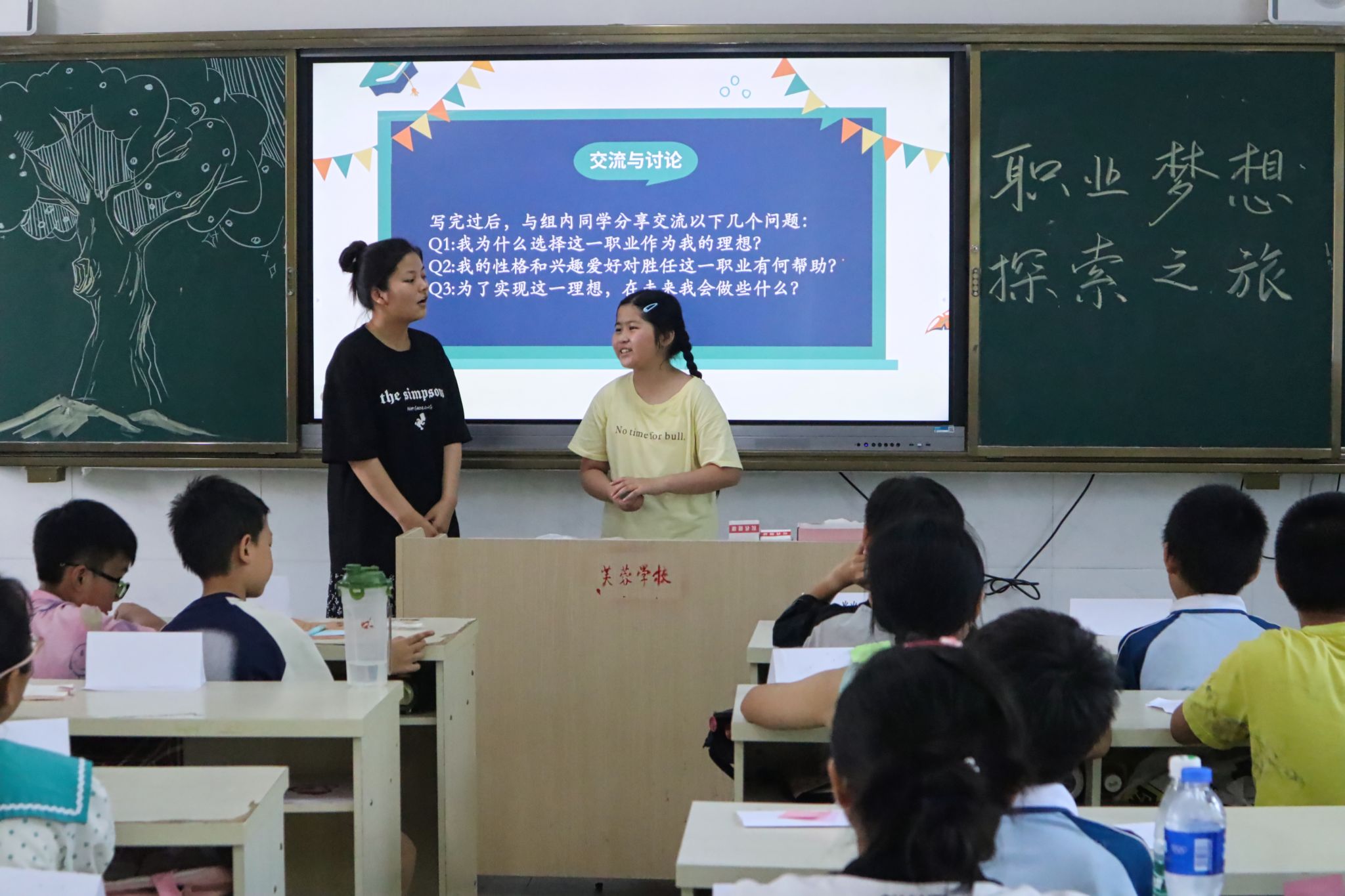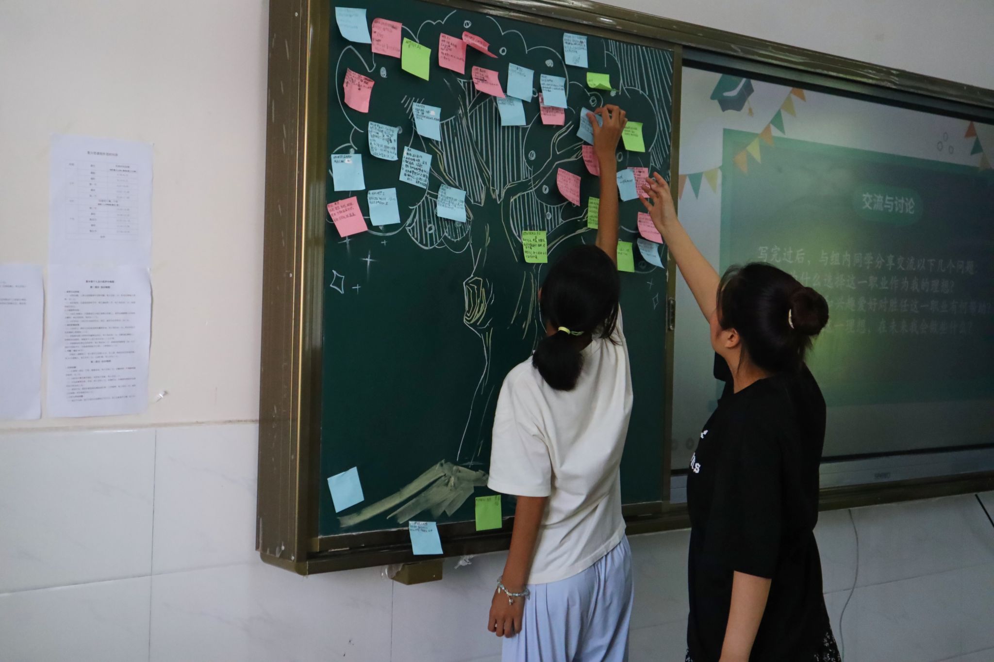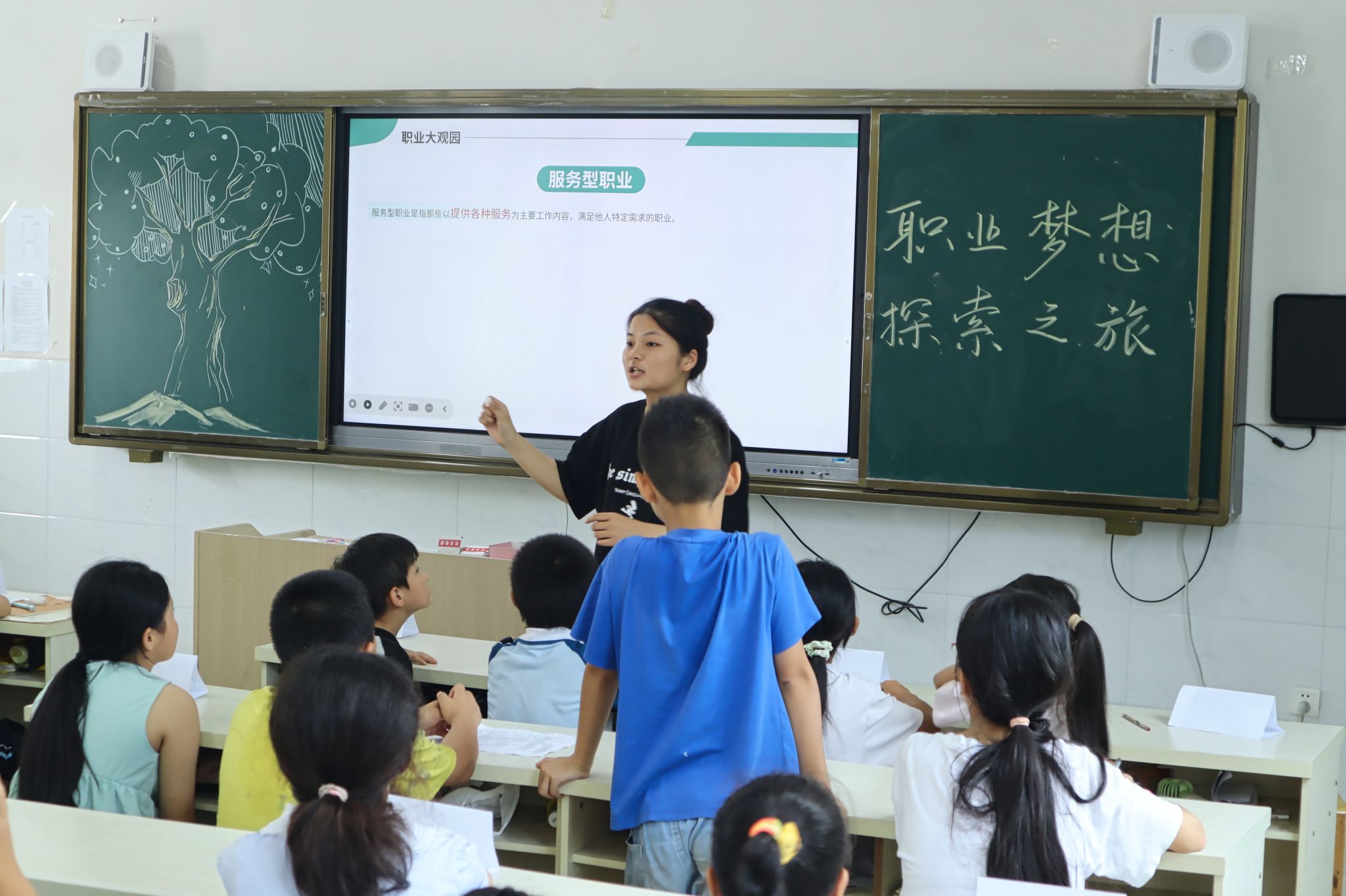课堂上,杨玉婷以播放职业主题视频的方式开启活动,引发孩子们对职业探索的关注。随后,杨玉婷提出相关问题,孩子们纷纷举手示意,依次走上讲台,分享各自对职业的看法与想法。在后续的互动环节中,杨玉婷向在场的孩子们发放了彩色便利贴和画笔,引导他们写下自己的梦想。这些承载着孩子们梦想的便利贴被贴在黑板上,组合成“梦想之树”。