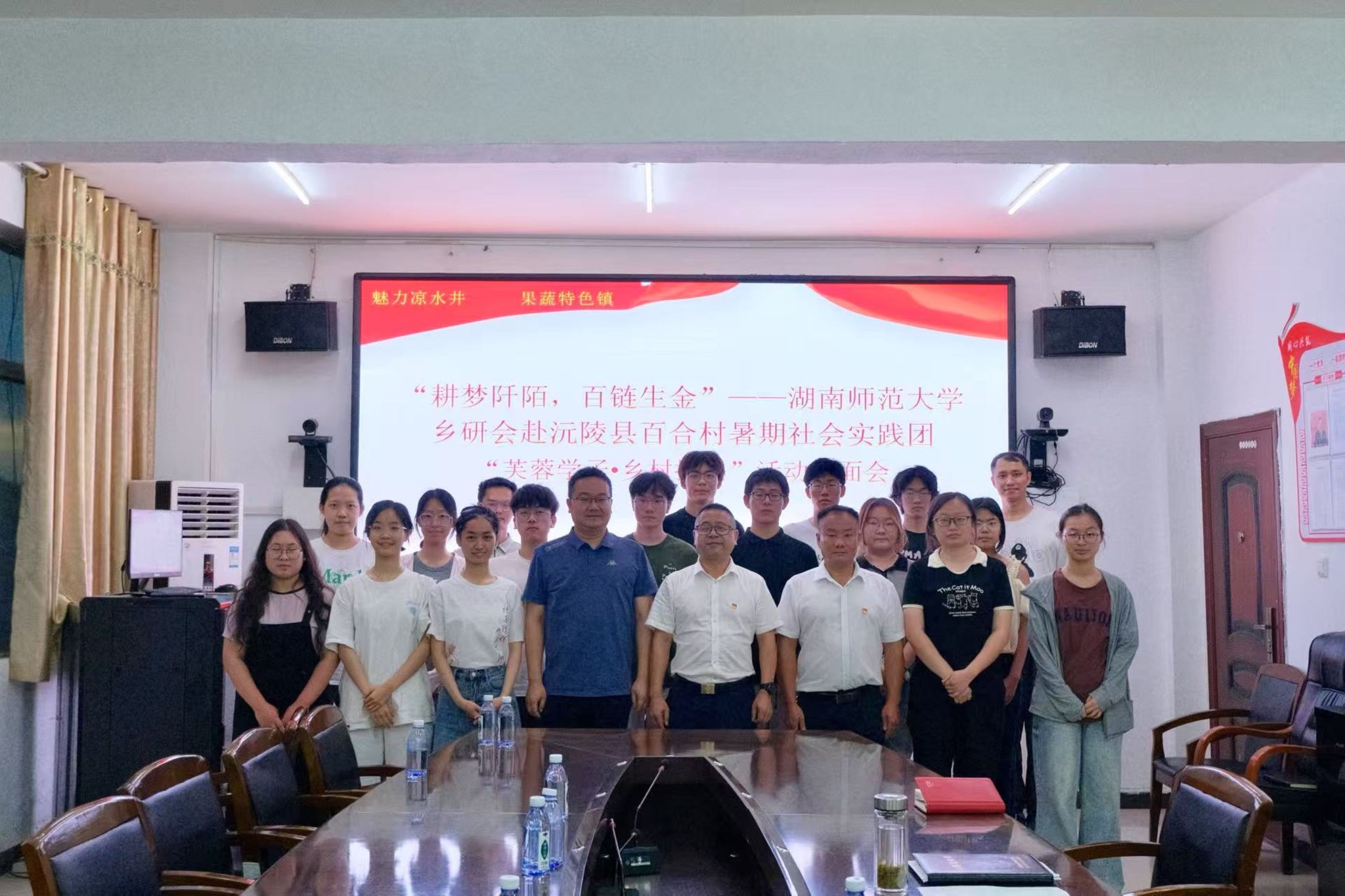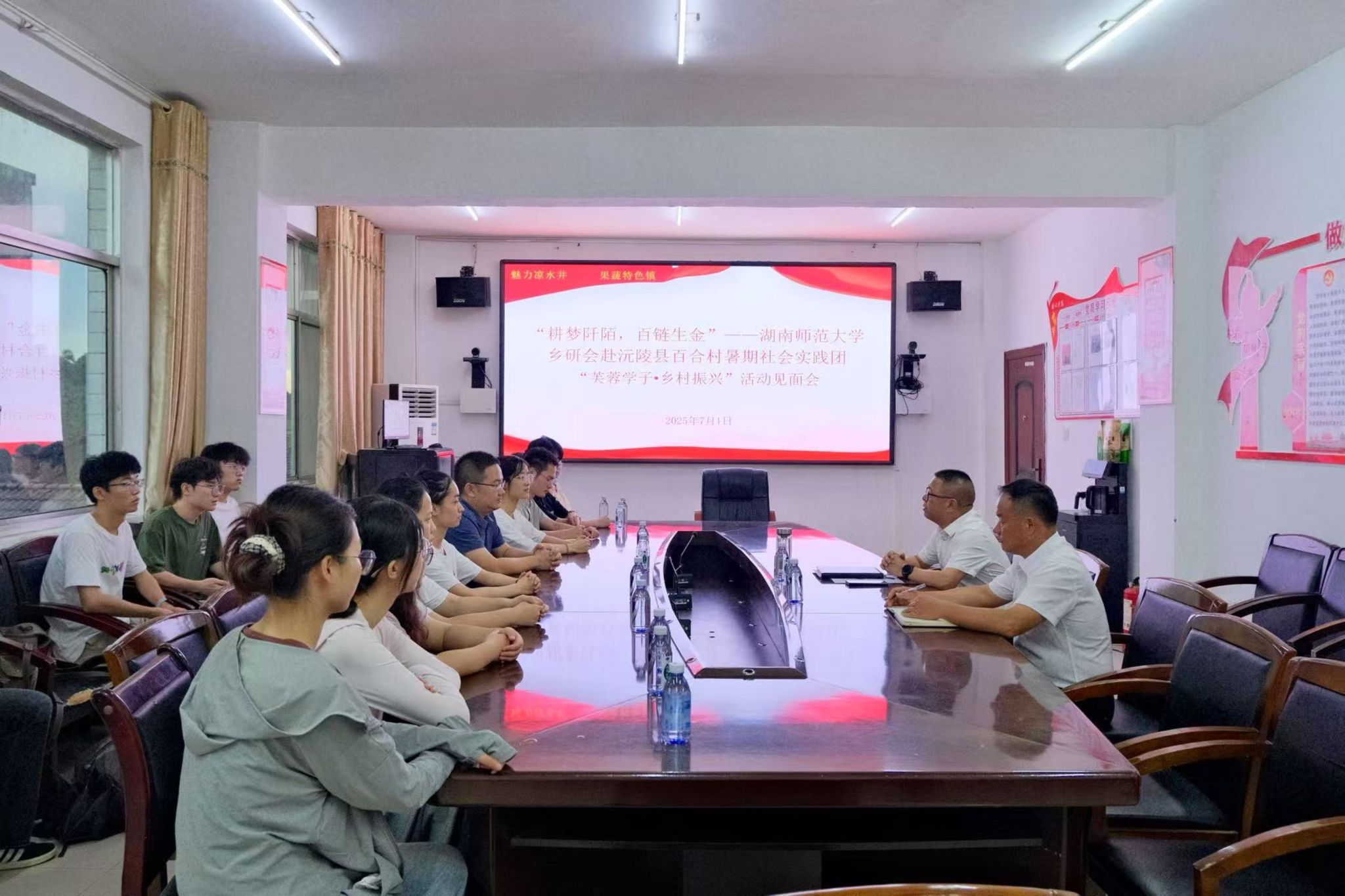 (通讯员 周涵韵 谢胜贤 谭欣雨)7月1日下午,公共管理学院“耕梦阡陌,百链成金”——乡研会赴沅陵县百合村暑期社会实践团(以下简称“耕梦者联盟”)抵达实践地,与凉水井镇党委书记谭顺环、凉水井镇百合村村支书吕曾南于凉水井镇政府三楼会议室举行三下乡活动见面会,队伍指导老师瞿理铜参与此次会议。