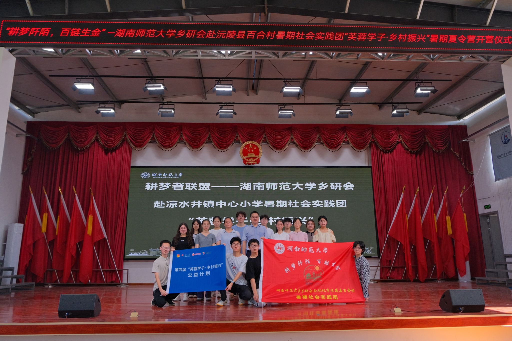 (通讯员 周涵韵 胡元浈 盛若水)7月2日上午,为促进三下乡期间教学活动的开展,公共管理学院“耕梦阡陌,百链成金”——乡研会赴沅陵县百合村暑期社会实践团(以下简称“耕梦者联盟”)在凉水井镇中心小学礼堂举行暑期夏令营开营仪式。凉水井镇中心小学书记李必伟、凉水井镇中心小学综治办主任余娟、队伍指导老师瞿理铜和耕梦者联盟全体队员参与此次仪式。